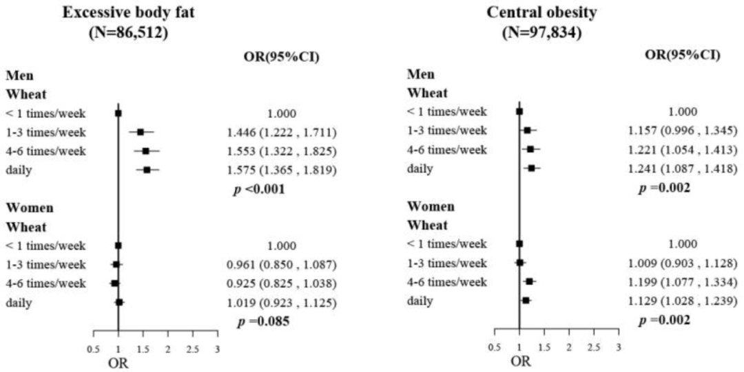 结果显示:小麦摄入量越高,男性发生全身肥胖以及中心肥胖的风险更大,而女性发生中心肥胖的风险同样上升;但在“干饭爱好群体”中并未观察到类似的趋势。
