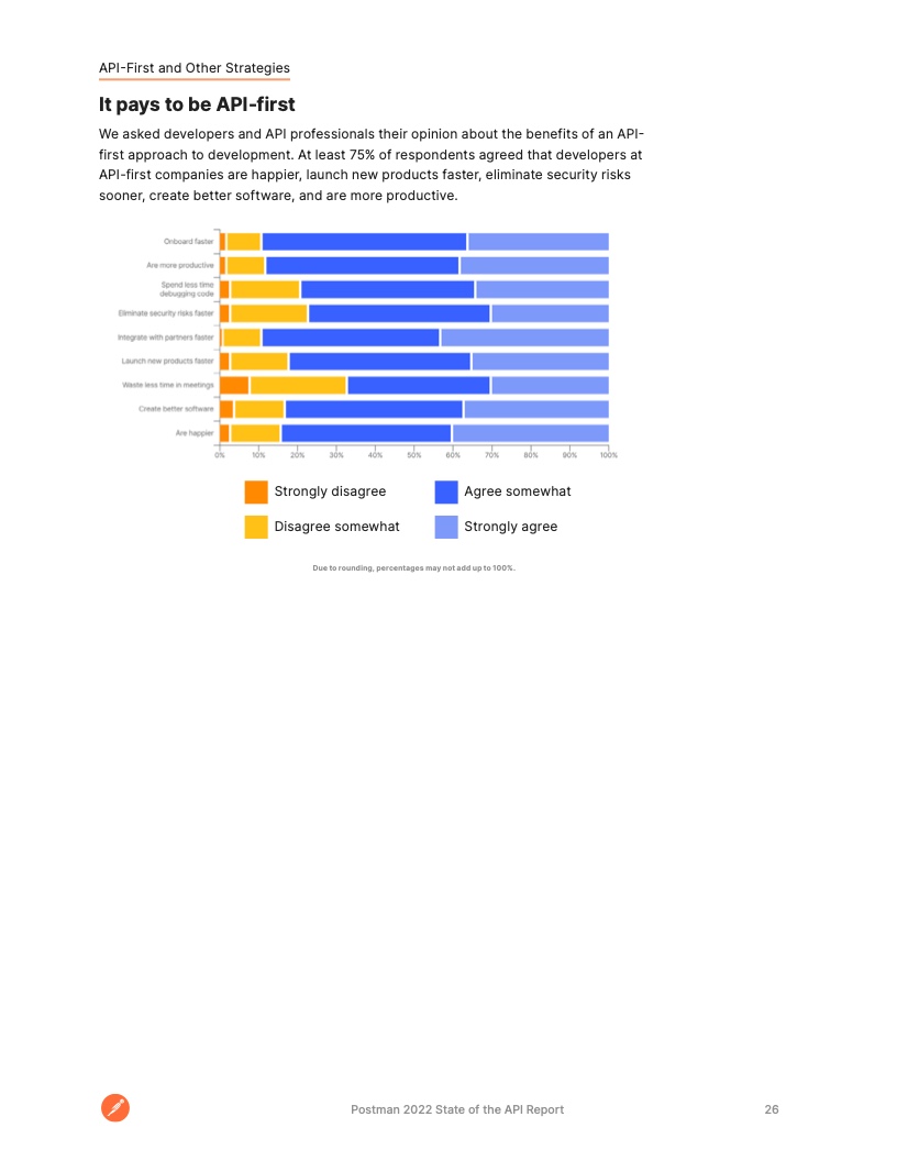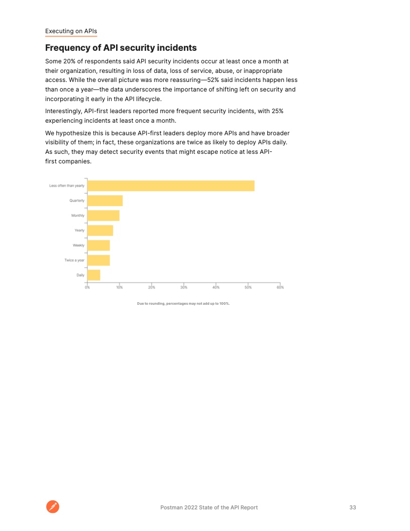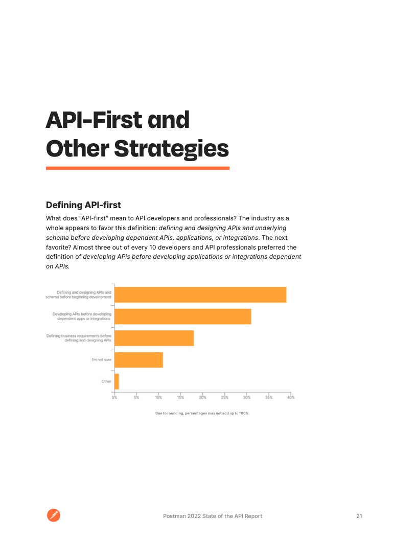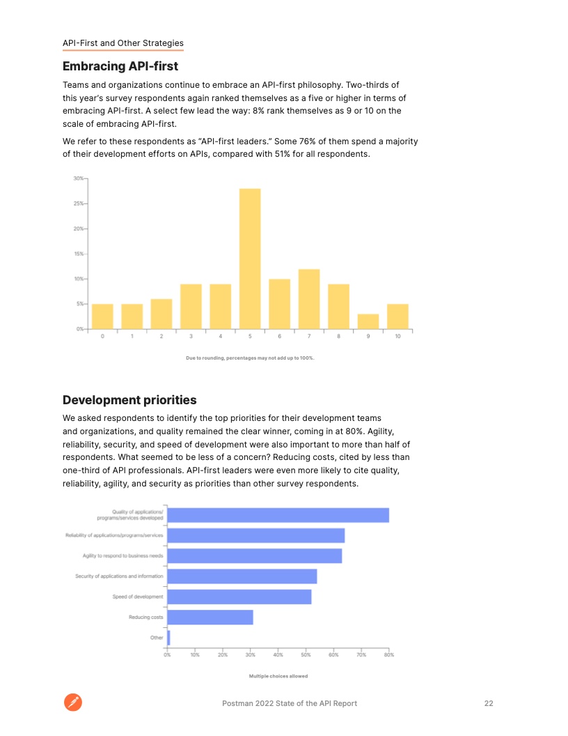 开发人员将大部分时间花在了 API 上。大约 51% 的受访者表示,他们所在企业将一半以上的开发工作花在了 API 上。这一比例高于 2020 年的 40% 和去年的 49%,凸显了 API 作为现代软件构建块的作用。