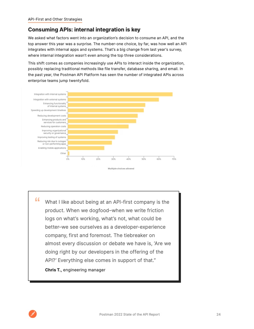 性能、安全性、可靠性和文档是与 API 集成之前受访者们的主要考虑因素,而决定是否使用和生成 API 的首要因素是它与内部应用程序和系统的集成程度。去年,内部 API 整合甚至没有成为 API 消费的前三名因素。