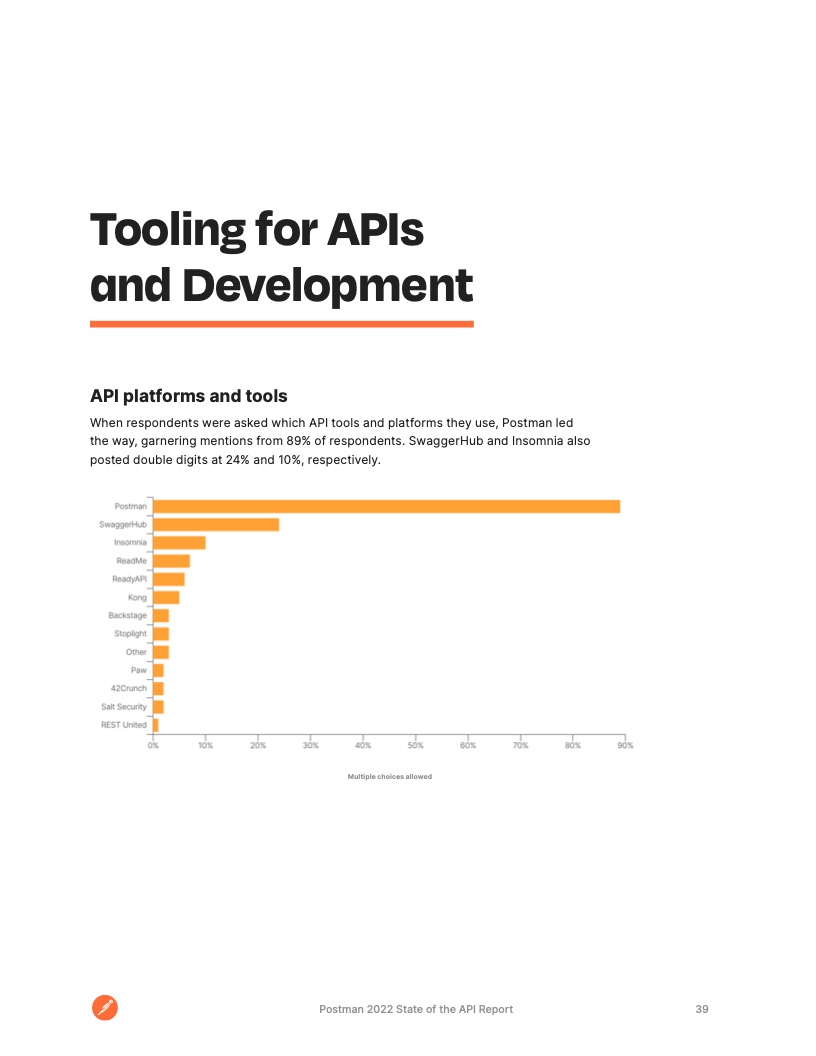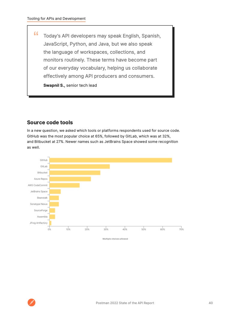 部署 API 的受访者使用了多种方法,其中 CI/CD 管道更受欢迎,61% 的受访者称这是最常用的工具。紧随其后的是在云中部署 API (38%)、框架 (35%) 和定制部署方法 (27%)。当被问及哪些 CI/CD 解决方案受到青睐时,一半的受访者提到了 GitHub。Jenkins (36%) 和 GitLab (28%) 也是热门选择,其次是 Azure Pipelines 和 Bitbucket(各占 22%)。