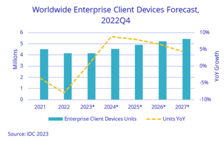 IDC 修改了其对瘦客户机市场的预测,预计 2023 年全球瘦客户机市场将持平至 410 万台左右。到 2024 年,瘦客户机市场可能会实现更强劲的复苏,与商用 PC 的预期复苏相吻合。