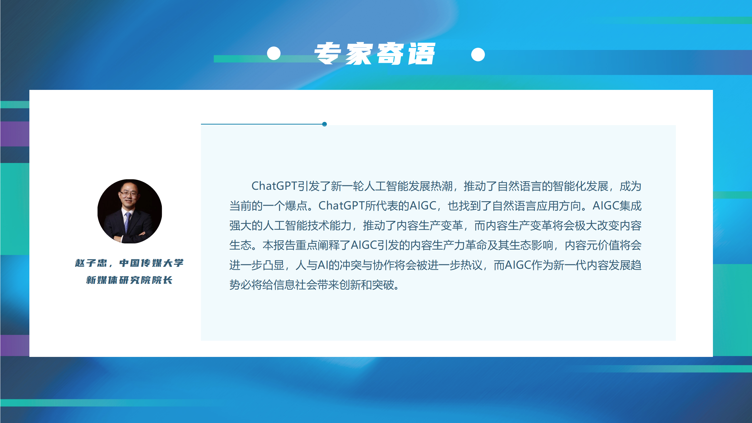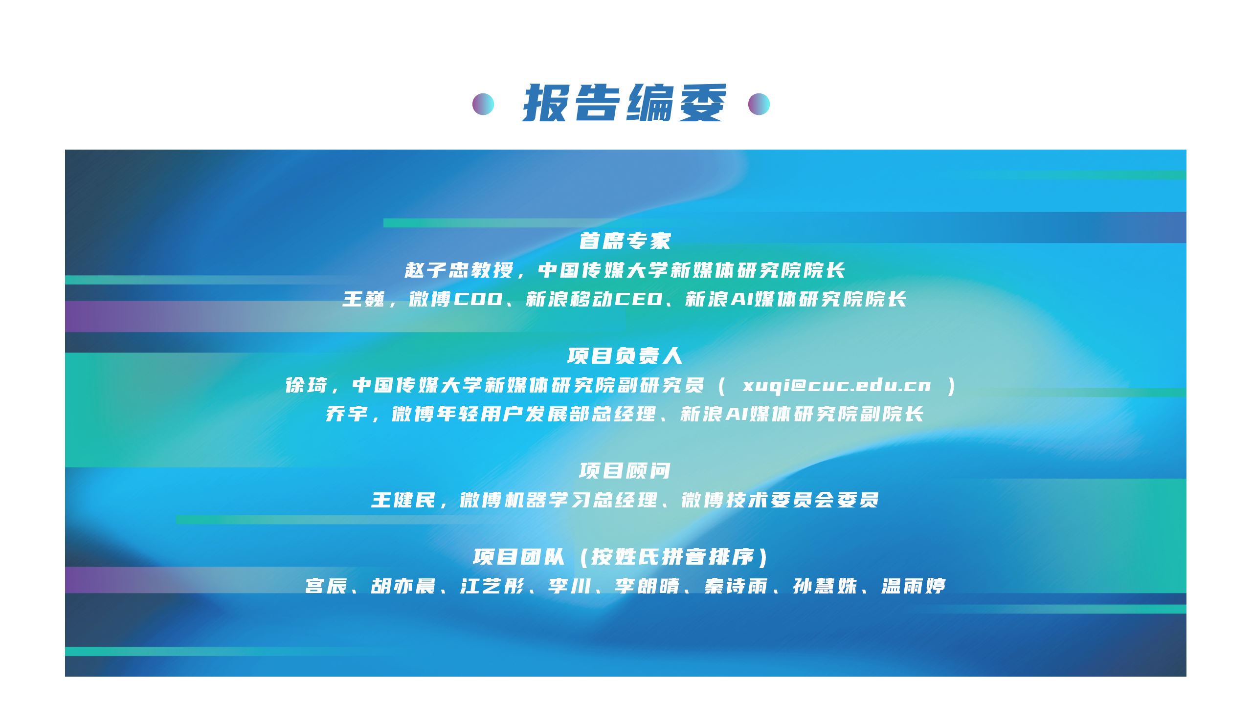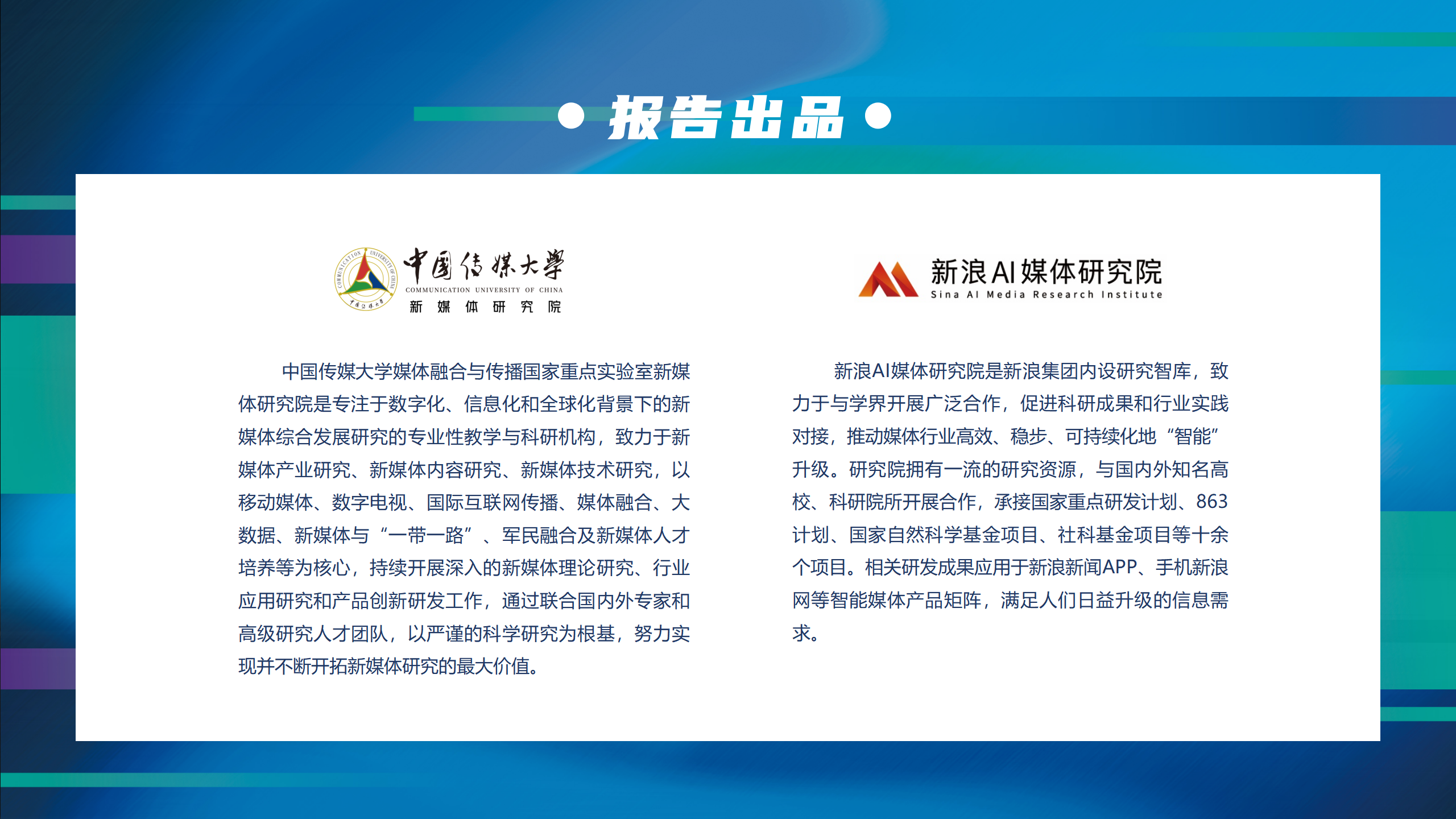 2023年3月15日,中国传媒大学媒体融合与传播国家重点实验室新媒体研究院与新浪AI媒体研究院联合发布《创造力:内容元价值之战——AIGC核心价值与生态影响洞察》。该课题由新媒体研究院院长赵子忠教授与微博COO、新浪移动CEO、新浪AI媒体研究院院长王巍担任首席专家,由新媒体研究院副教授、中国传媒大学青年拔尖人才徐琦与微博年轻用户发展部总经理、新浪AI媒体研究院副院长乔宇担任项目负责人,由微博机器学习总经理、微博技术委员会委员王健民担任项目顾问,由中国传媒大学新媒体研究院与新浪AI媒体研究院团队共同完成。