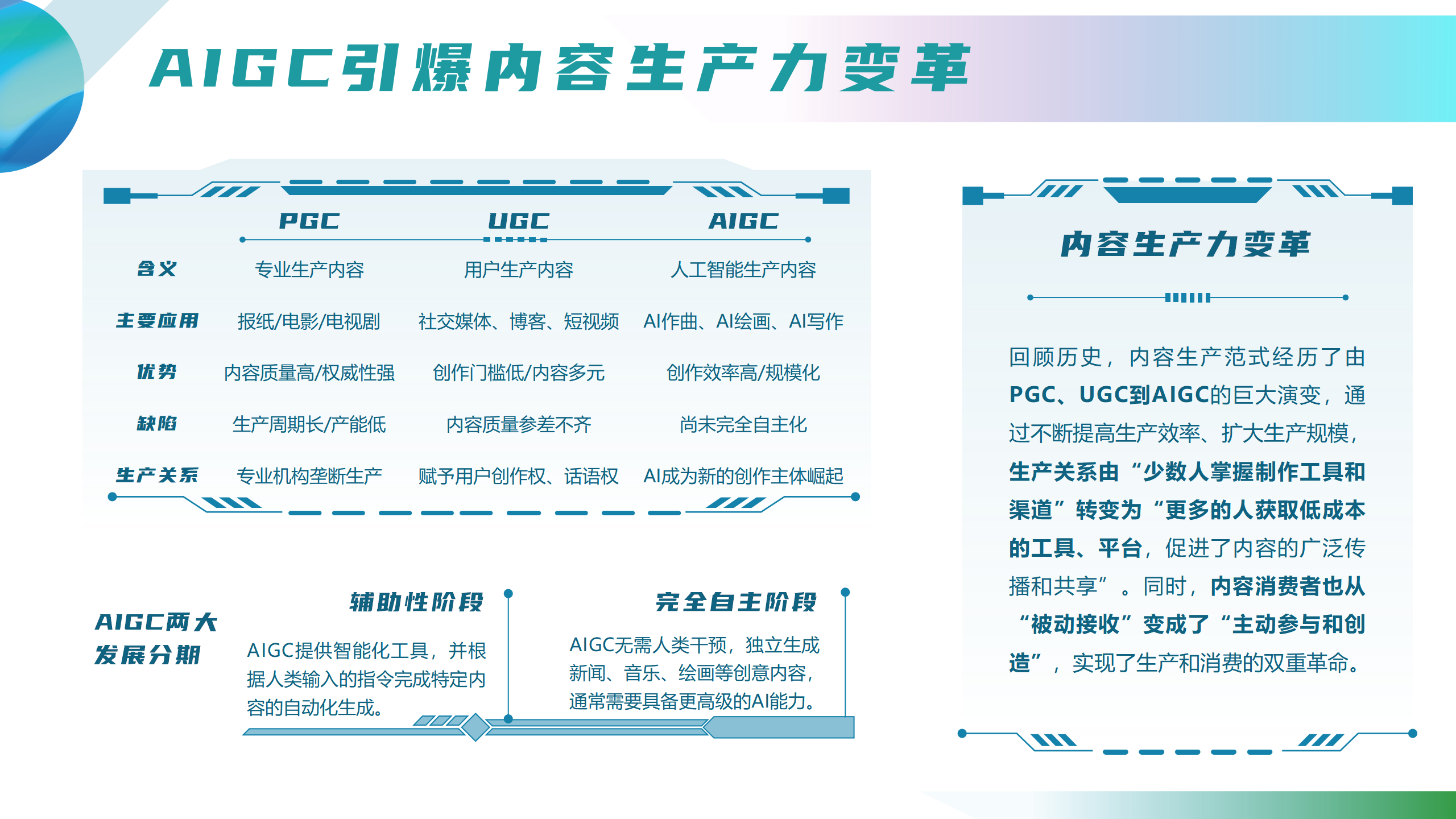 看点3:内容生产范式经历了由PGC、UGC到AIGC的巨大演变,通过不断提高生产效率、扩大生产规模,生产关系由“少数人掌握制作工具和渠道”转变为“更多的人获取低成本的工具、平台,促进了内容的广泛传播和共享”,内容消费者也从“被动接收”变成了“主动参与和创造”,实现了生产和消费的双重革命。