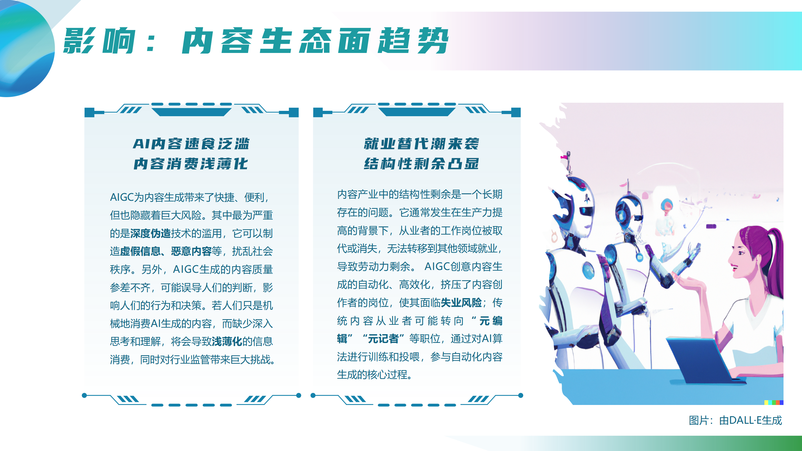 看点6:AIGC的发展深刻影响了内容生态:AI作为内容生产主体的地位崛起,其内容产出量质升级,实现增效降本;AIGC重塑人智协作的内容生成范式,开启人智交互的内容消费方式,由AI巨头引领的内容生态洗牌业已展开;AIGC将成为元宇宙媒介化社会到来的“加速器”。与此同时,AIGC带来的内容速食泛滥、内容消费浅薄化、就业替代及结构性剩余问题也需引起警惕,未来,人类应积极理性应对AIGC带来的变革与挑战。
