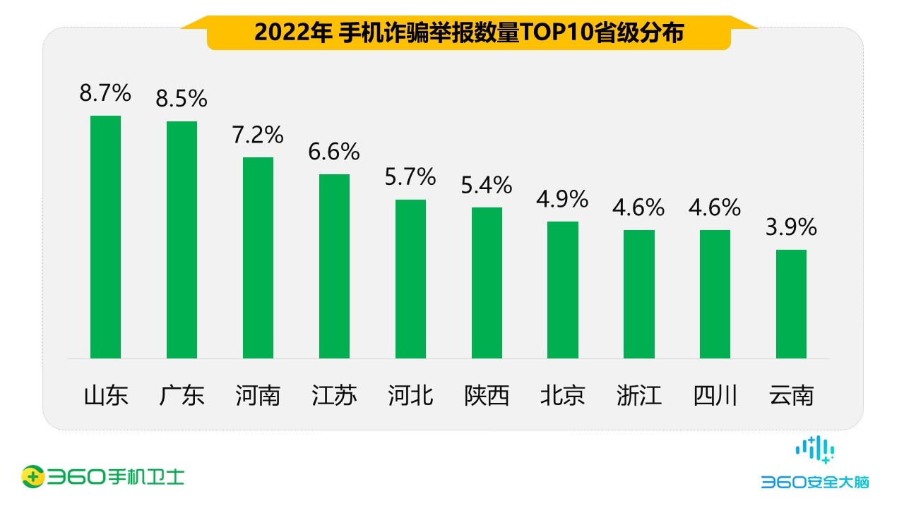 在地域分布上,山东成为诈骗“重灾区”,占用户举报的8.7%。其次为广东省和河南省,占比分别为8.5%和7.2%。另外北京受骗用户最多,占4.9%,其次为西安、郑州、昆明和温州。