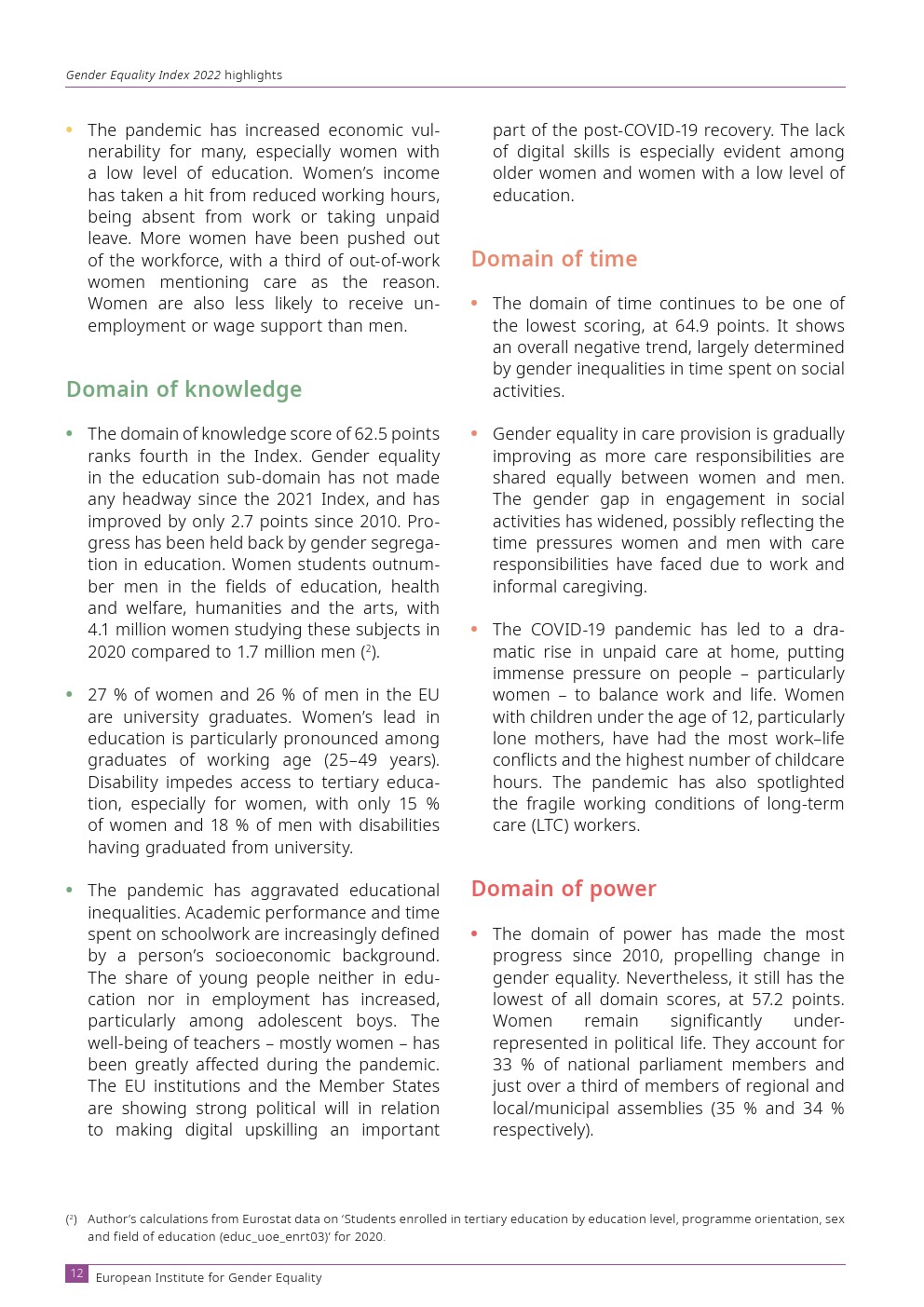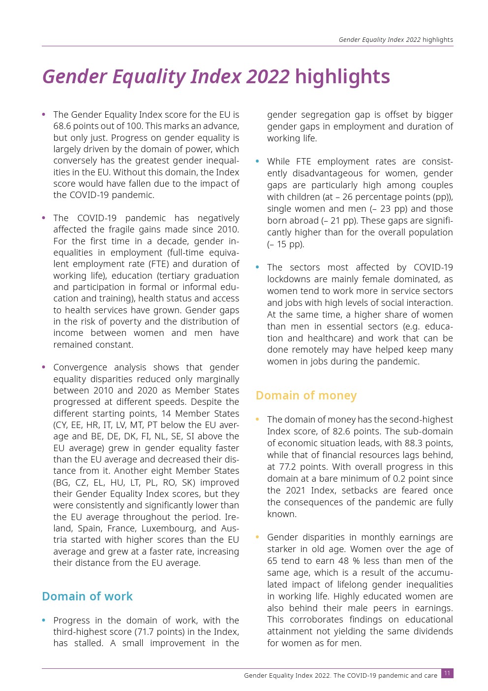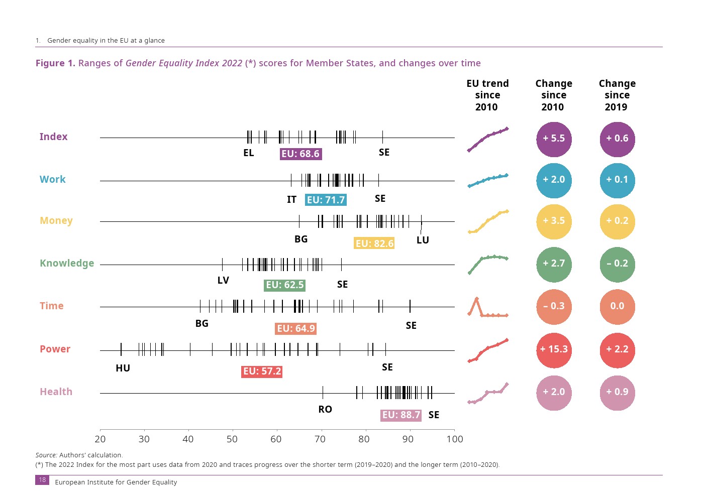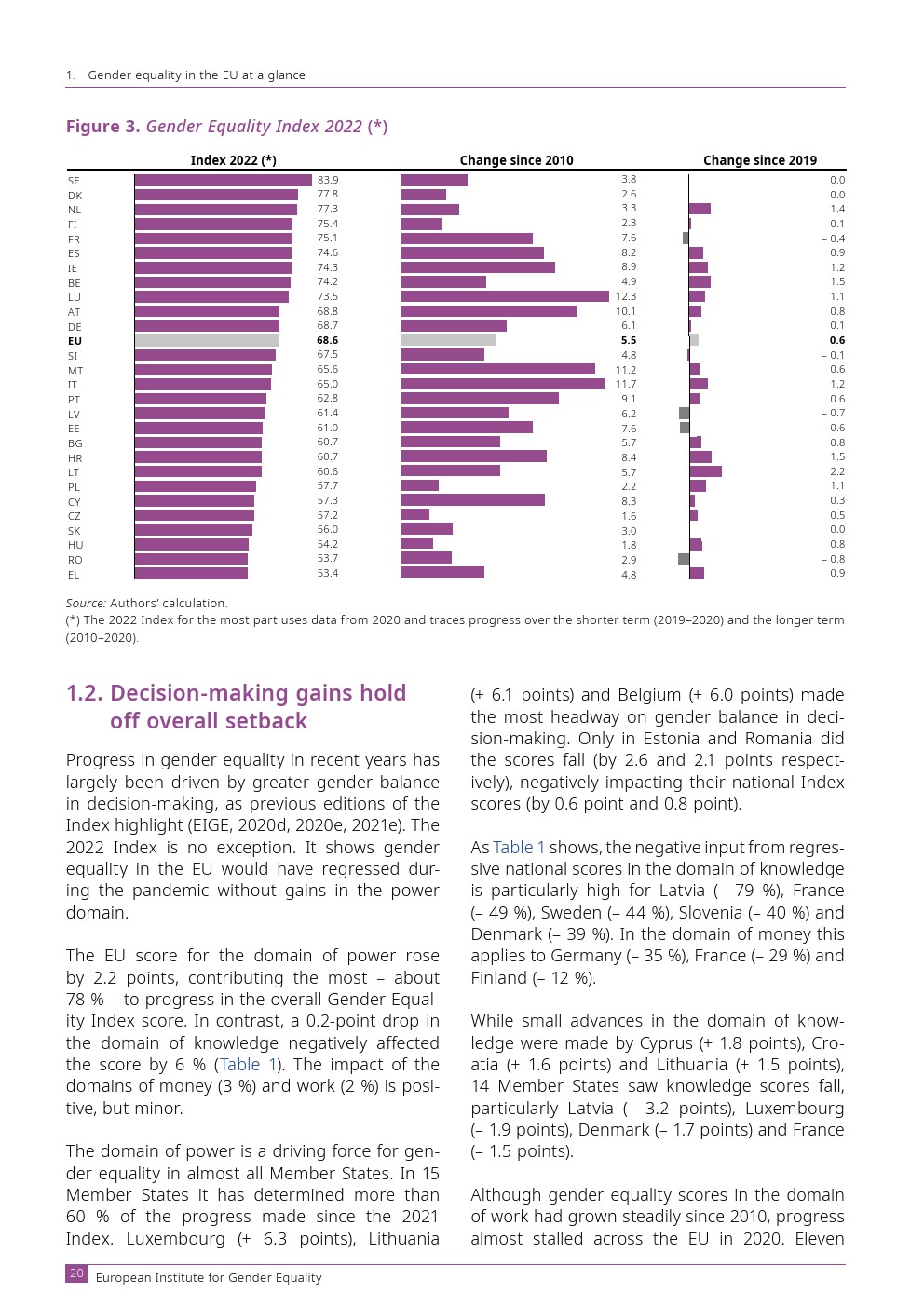 欧洲性别平等研究所发布了“2022年性别平等指数”。欧盟的性别平等指数得分为 68.6 分(满分 100 分)。这标志着进步,但仅此而已。性别平等的进步在很大程度上是由权力领域推动的,而权力领域反过来在欧盟具有最大的性别不平等。如果没有这个域,指数得分将会下降。
