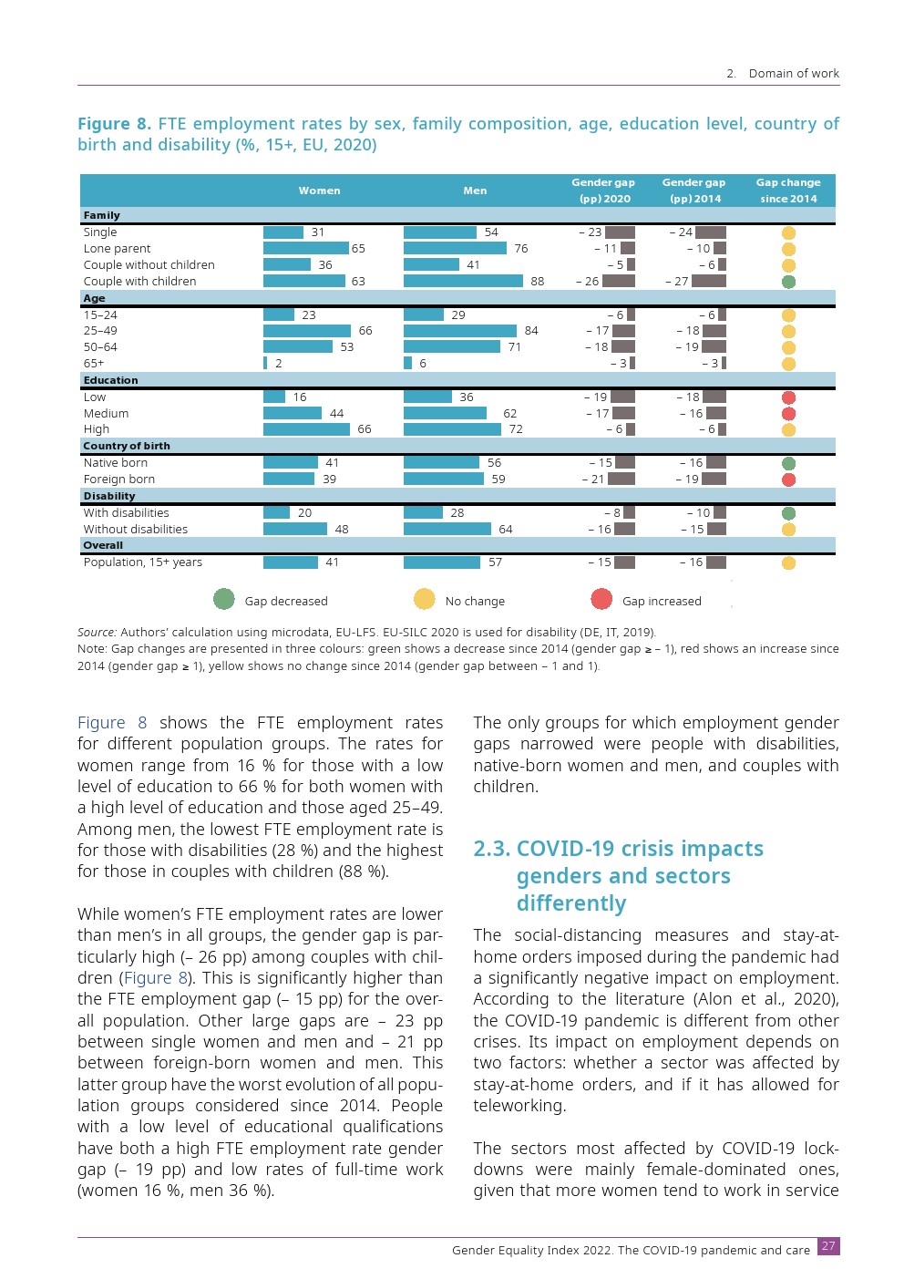 虽然 FTE 就业率一直对女性不利,但在有孩子的夫妇(– 26 个百分点)、单身女性和男性(– 23)和在国外出生的人(– 21)中,性别差距尤其大。这些差距明显高于总人口 (– 15)。