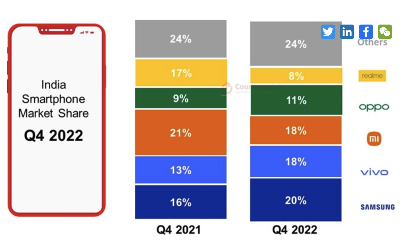三星的这些举措帮助其在竞争激烈的印度手机市场从小米手中夺走了领导者地位。市场研究公司 Counterpoint Research 的数据显示,去年第四季度,三星在印度手机市场的份额达到 20%,超过了小米的 18%。