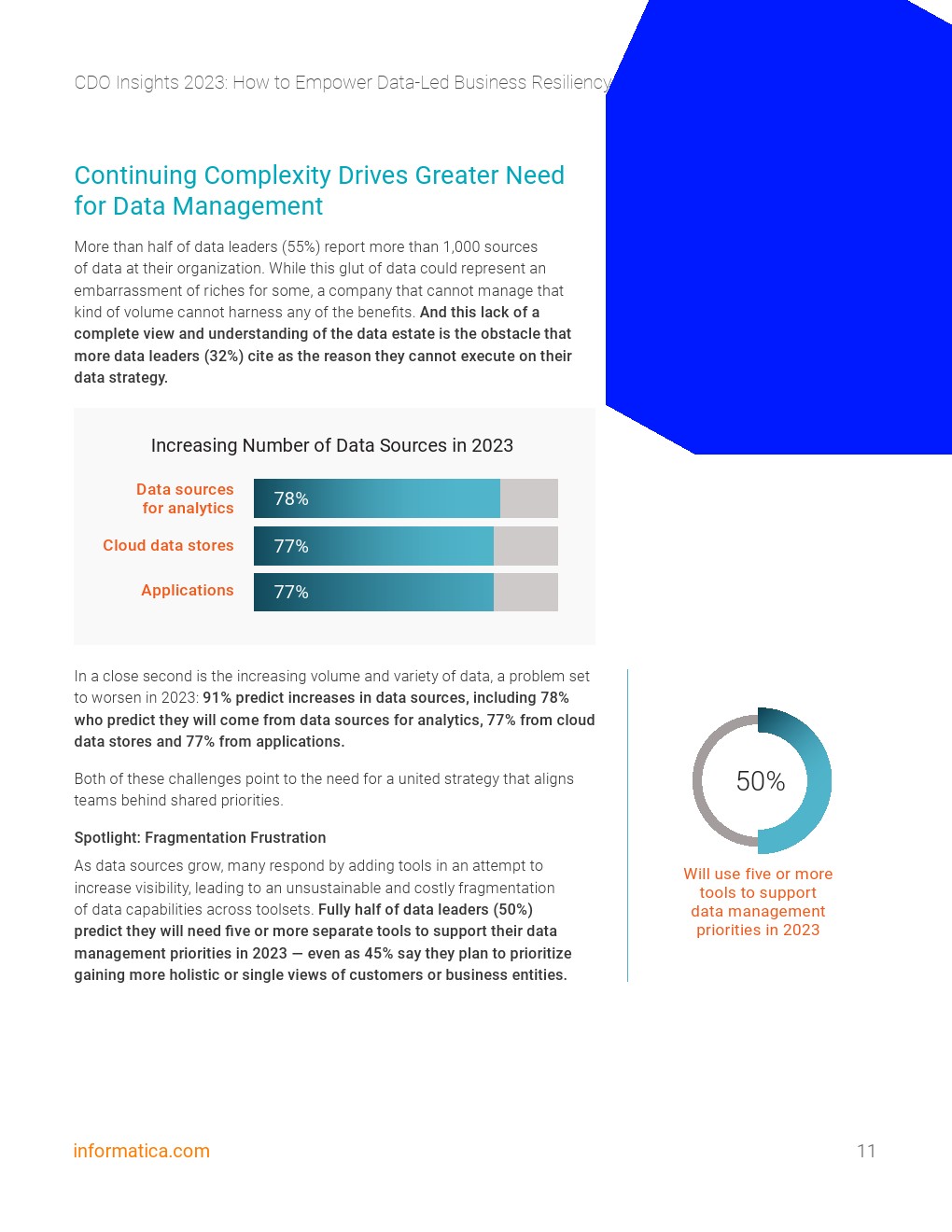 预计这些增长将来自分析数据源(77%)、云数据存储(77%)和应用程序(77%)。难怪600名首席数据官、首席分析人员以及接受调查的首席数据和分析人员报告的最大挑战之一是数据的数量和种类不断增加。