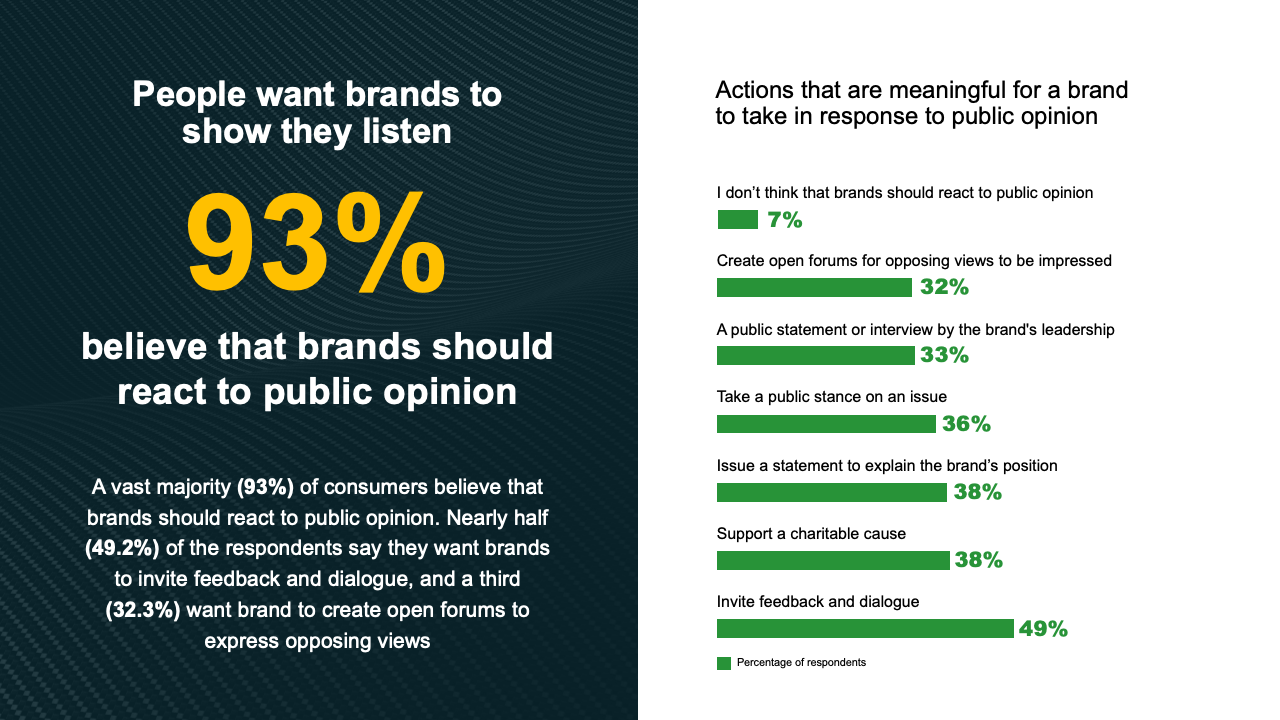 消费者是否希望品牌回应舆论? 与公司的互动如何影响消费者的品牌认知? 公司在倾听消费者意见方面做得好吗? 领导人需要就有争议的问题发表意见吗?