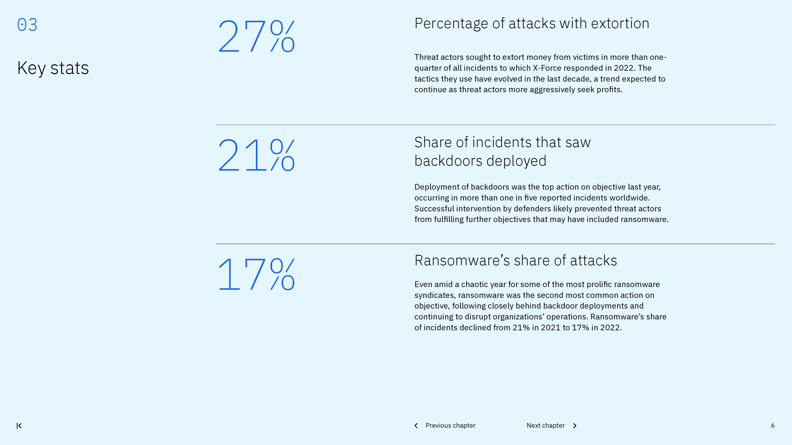 2022 年是网络安全又一个动荡的年头。IBM Security® X-Force® 目睹了机会主义威胁行为者利用混乱环境优势渗透全球政府和组织。