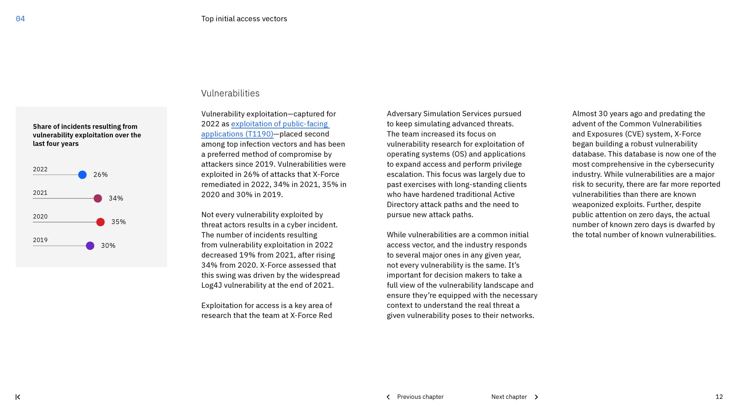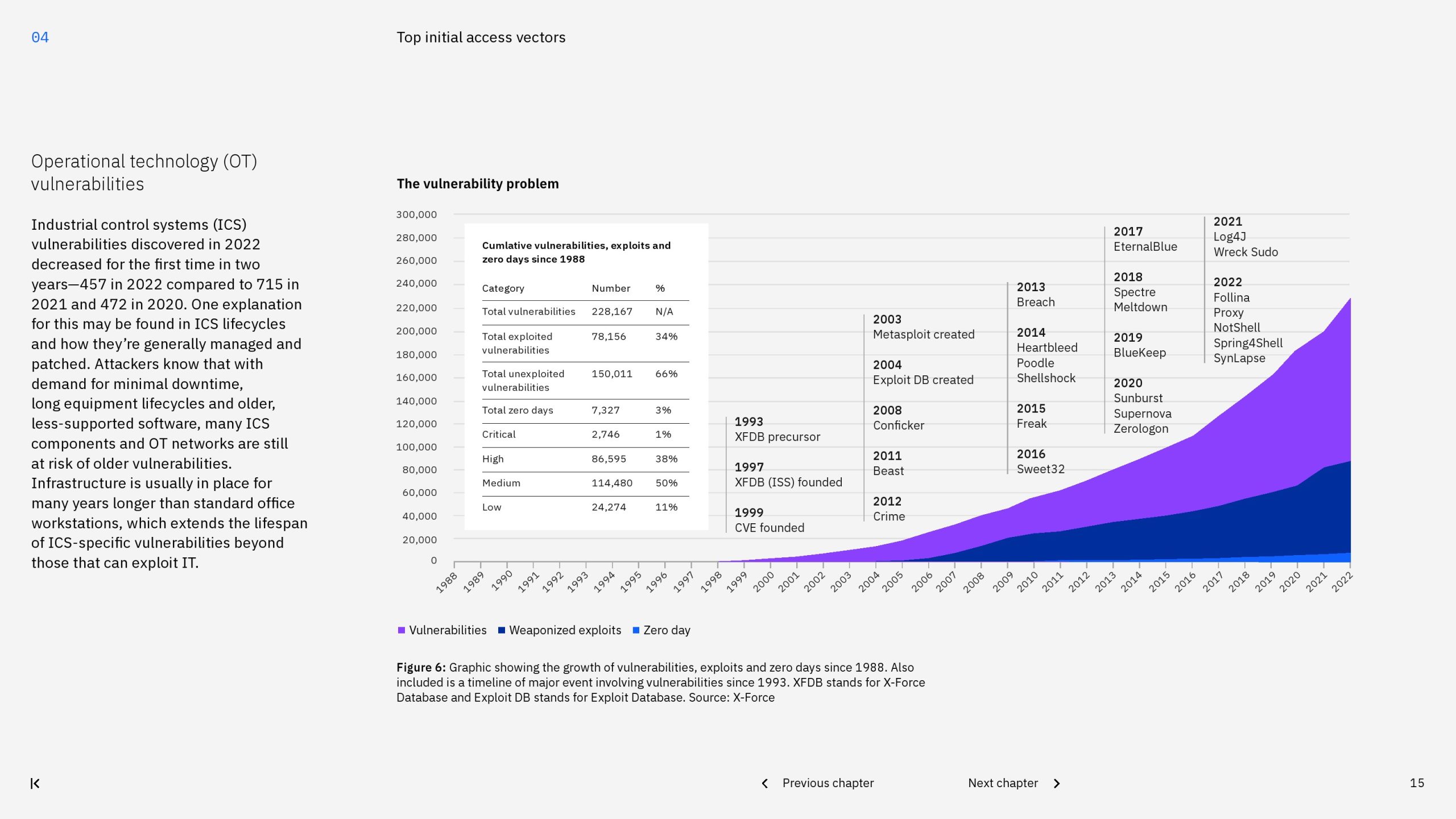 - 漏洞利用和零日攻击:从我们强大的漏洞数据库(包括近 30 年的数据)中推断有助于为我们的分析提供背景信息并确定漏洞造成的实际威胁。 这一过程还为可武器化的漏洞利用和有影响的零日攻击所占比例的减少提供了背景。