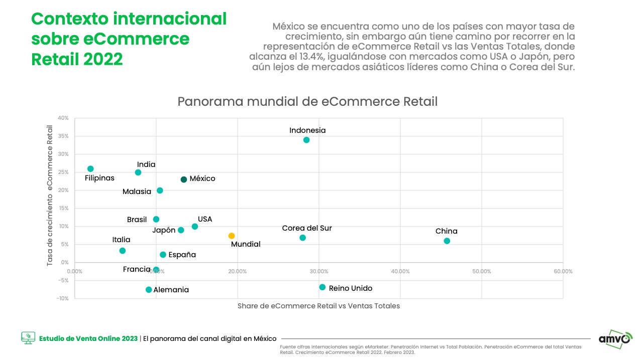 在2022年,墨西哥电商零售部门通过数字渠道创造了超过528亿美元的销售额,与2021年相比年增长率为23%。2022年,电商零售对零售总额的贡献为13.4%,而2021年的电商零售对零售总额的贡献为12.1%,墨西哥电商在4年内的价值增长了2.9倍。从整个世界的电商环境来看,墨西哥已达到电子商务在世界增长的世界平均水平7.4%。