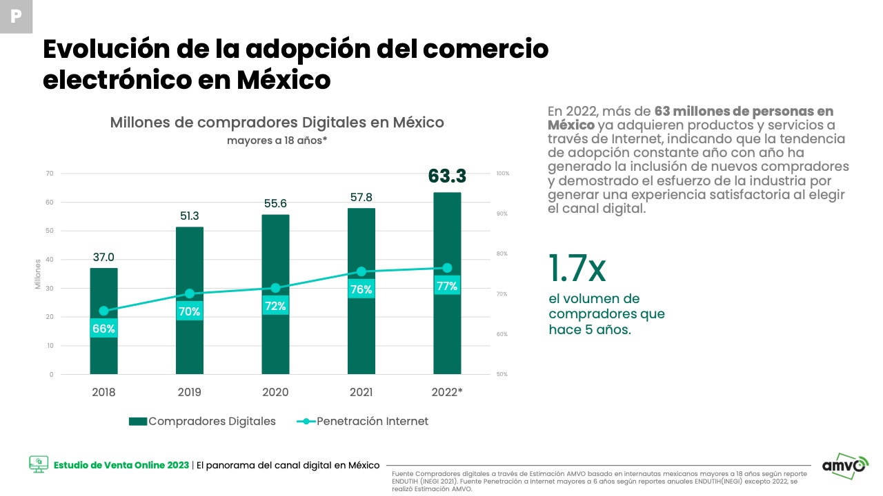 看墨西哥电商市场的演变,从下图可以看到墨西哥从2018-2022年的卖家数量和互联网使用率是不断上升的,从2018年的3700万网购人数增长到了6300万网购人数。
