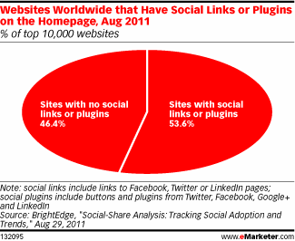 SEO平台BrightEdge Technologies针对前10万家网站的研究发现,53.6%的网站包括至少一种社会化分享工具和插件,相比2010年52.8%的数据有所上升。