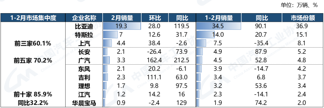 2023年1-2月,新能源汽车销量排名前十家的企业集团销量合计为80.1万辆,同比增长32.2%,占新能源汽车销售总量的85.9%,高于上年同期7.4个百分点。