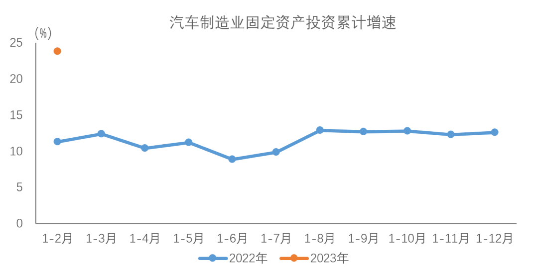 中国汽车工业协会:2023年1-2月汽车制造业固定资产投资同比增长23.8% 据中国汽车工业协会整理的国家统计局数据显示,2023年1-2月,汽车制造业固定资产投资继续保持较快增长。 2023年1-2月,汽车制造业固定资产投资同比增长23.8%,高于全国固定资产投资18.3个百分点,高于制造业固定资产投资15.7个百分点。 更多阅读:中国汽车工业协会:2022年1-7月汽车制造业固定资产投资平稳增长中国汽车工业协会:2023年1-7月汽车制造业固定资产投资保持较快增长中国汽车工业协会:2022年1-10月汽车制造业固定资产投资快速增长中汽协会:2022年1-2月汽车制造业固定资产投资同比呈较快增长中国汽车工业协会:2022年1-9月汽车制造业固定资产投资快速增长中国汽车工业协会:2023年1-4月汽车制造业固定资产投资中国汽车工业协会:2023年1-8月汽车制造业固定资产投资保持较快增长中国汽车工业协会:2022年3月前十位轿车品牌销量排名中国汽车工业协会:2021年5月汽车工业运行情况简述中国汽车流通协会:2020年4月中国进口汽车市场月报2020年1月份京城汽车市场分析中国汽车工业协会:2023年1-2月我国汽车商品出口金额前十国情况简析中国汽车流通协会:2020年3月份国内狭义乘用车市场销量达104.5万辆 同比下降40.4%中国汽车流通协会:2020年第一季度豪华品牌新增授权4s店57家 退网4s店41家中国汽车流通协会:2022年4月中国汽车保值率报告
