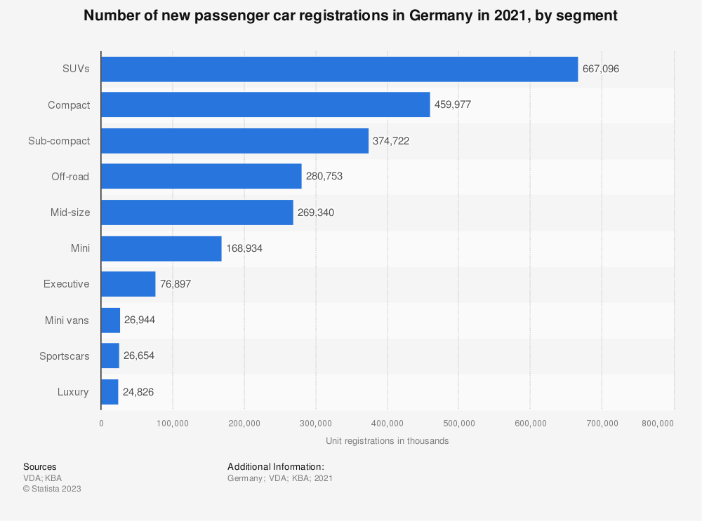 在新乘用车中,2021年该国最受欢迎的汽车类别是运动型多用途车(SUV),约有66.7万辆新SUV注册。2021年,大众汽车以18.4%的市场份额成为德国最大的汽车品牌,将竞争对手远远甩在后面。
