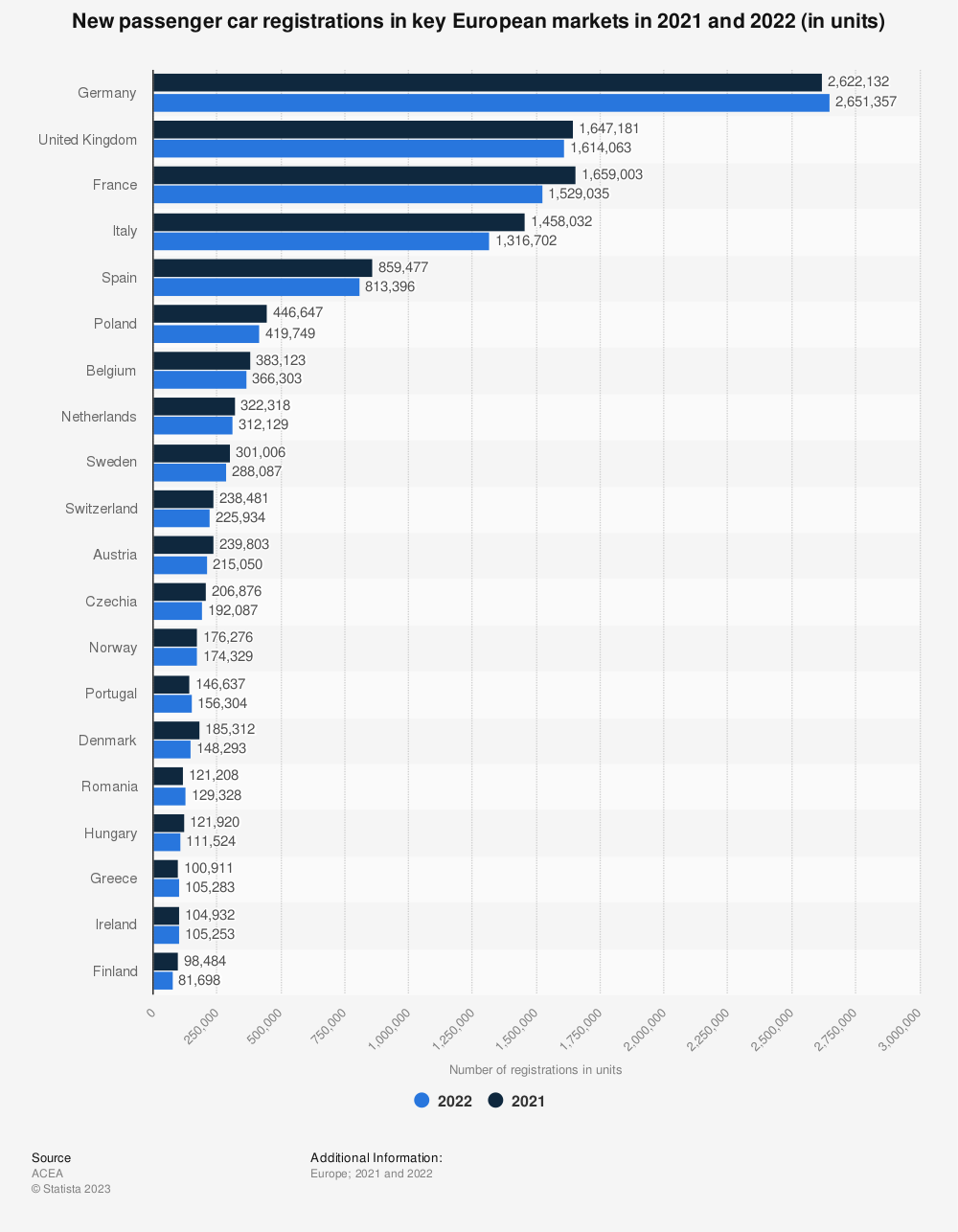 2021年和2022年欧洲主要市场的新乘用车注册量(单位:辆) 数据来源:Statista.com