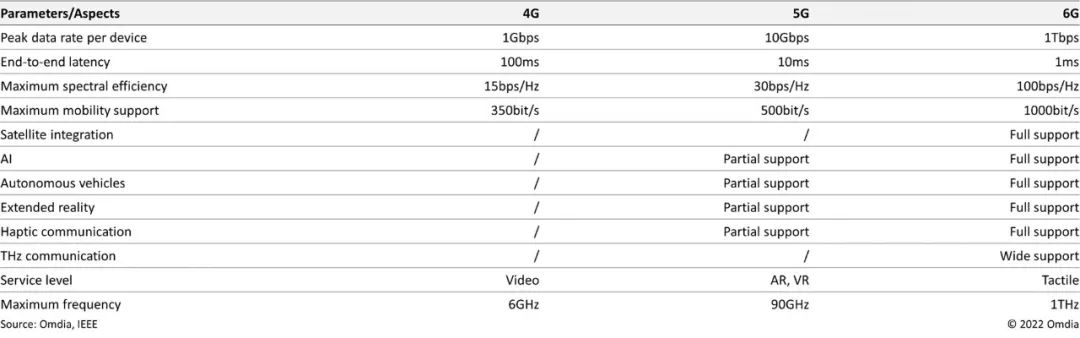 无线通信技术向 5G 演进为 6G 的发展奠定了基础—与 5G 相比,预计 6G 需要更高的性能、容量和能力来为未来的用例赋能并证明自身价值。下表对 4G、5G 以及预想中的 6G 的特性 / 性能进行了比较。
