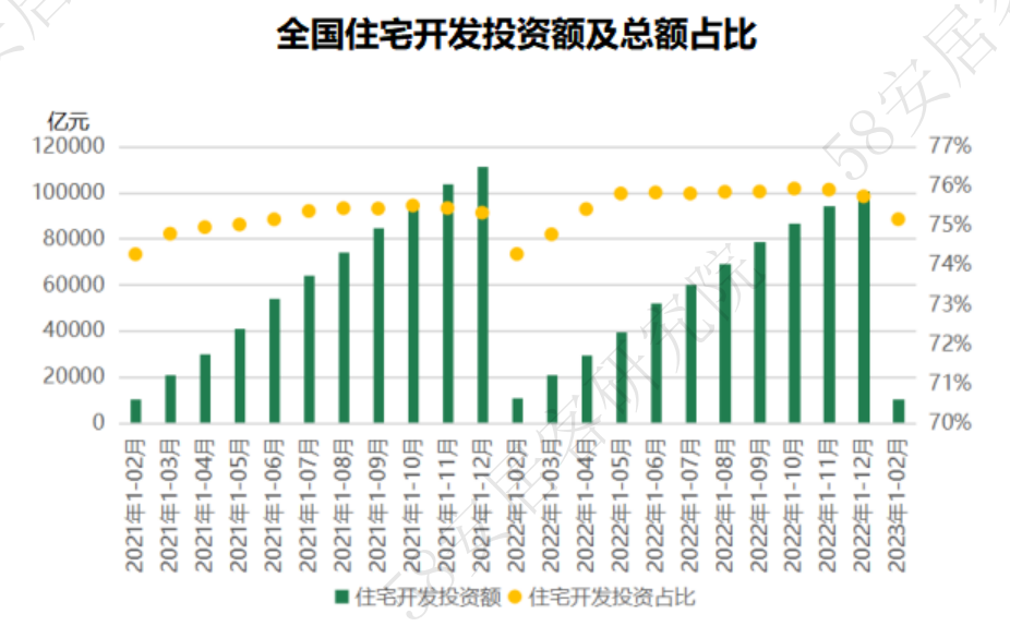 2023年1-2月,全国房地产开发投资额和住宅开发投资额分别为13669亿元、10273亿元,同比降幅均较此前有大幅收窄,降幅分别为5.72%和4.61%。
