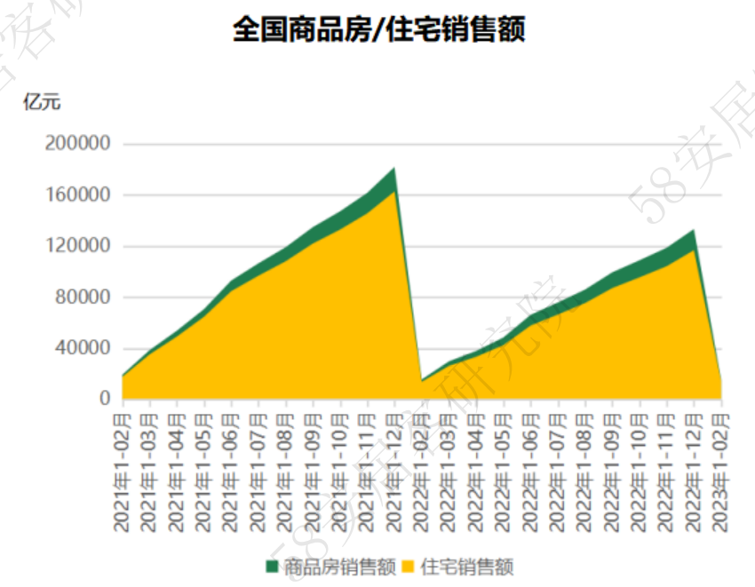 2023年1-2月,全国商品房销售面积15133万平米,同比下滑3.63%,其中住宅销售面积占到88%,为13387万平米,同比仅下滑0.56%。1-2月商品房销售金额15449亿元,同比降幅0.06%,而住宅销售金额为14134亿元,同比出现了3.53%的上扬。