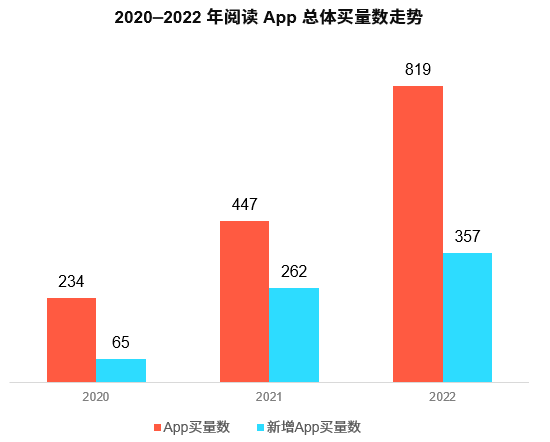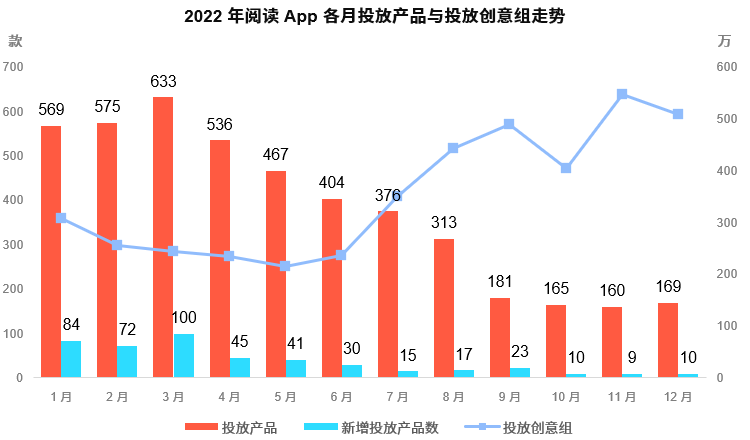 多数泛娱乐类买量App数量明显高于2021年的水平,其中2022年短视频App买量数提升幅度达到175%,达到接近350款的水平。 而阅读App的买量竞争程度同样不可小觑,自疫情以来,阅读App投放产品数增长量连年攀升,2022年的投放产品数量超过800款。 但进入暑期后,阅读App的总体买量产品规模下滑,但整体投放量得到普遍提升。其中头部App在该阶段逐渐拉开与中尾部App的买量差距,致使9月份成为阅读类App买量的“分水岭”。