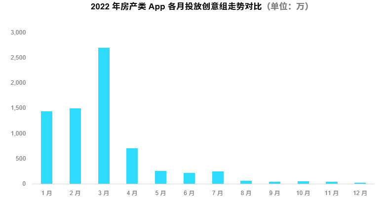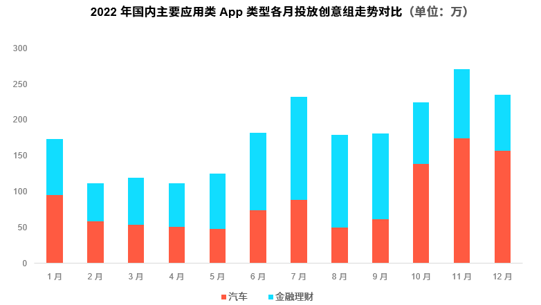 基于疫情严控局势以及整体经济下行的大环境下,房产类、商旅出行类App,无论是年投放产品数还是创意组数,均持续两年同比出现下滑的现象,其中房产类App自Q2始的投放量一路骤降至Q1的10%左右。不过,于此同时国家也对一些其他重点行业陆续颁布了一系列积极的政策,行业的消费需求通过政策的刺激得以释放,如汽车、金融理财以及生活服务类App的投放量在一些重要“政策颁布时点”,实现明显的买量获客增长。