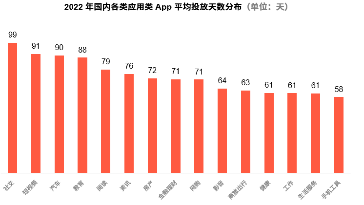 六、 泛娱乐App投放力度相对持久,社交类App投放平均天数迫近百天且投放门槛高