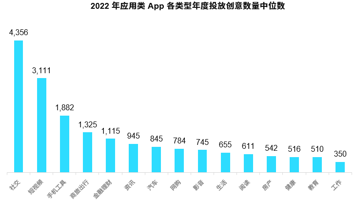 2022应用类App买量市场,总体平均投放周期为69天。泛娱乐App普遍表现高于平均值,均排名中上游。其中社交类App平均投放周期最高,约达99天。 值得一提的是,手机工具投放周期平均不足两个月,是投放周期最短的App类型,因此短期内集中爆量的现象非常突出。但根据两类APp年度投放创意组中位数排名来看,均排进前三。 可见,该两类App的“买量门槛”相对较高。