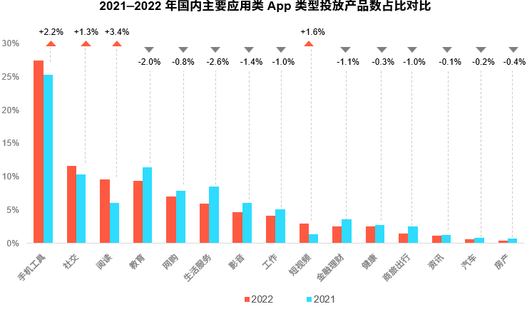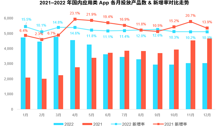 2022年整体移动 App 行业出现了较大的变化,新增活力有所下降,“降本增效”成为企业发展的核心策略,营销买量态度变得相对谨慎。此外,随着规范行业秩序的政策持续落地,不少应用App因此遭到下架处理,部分企业甚至调整赛道寻求新的增长机会。
