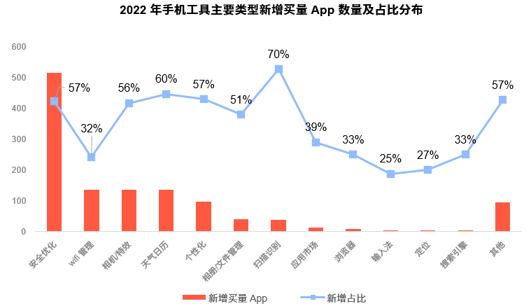 二、 手机工具App蝉联买量产品数量榜首, 安全优化App仍是最“拥挤”的赛道, “扫描识别”凭新技术加持而受宠