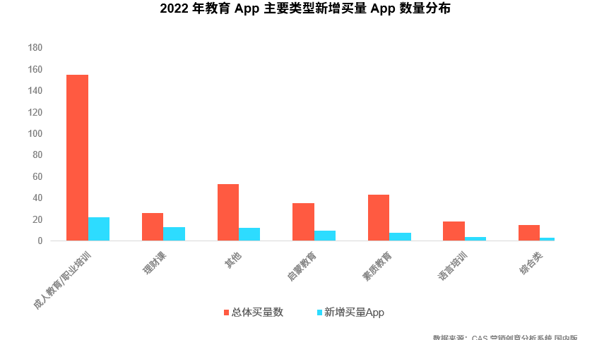 2022 年整体教育类 App 投放产品数几乎与 2021 持平,但新增数量却进一步下调。K12 类 App 随政策性调整影响,该类买量App进一步向“成教类”与“语言培训类”分化;二者的比重同步均进一步上调。尤其成教类新增买量App,除“学历考证”的App外,鉴于疫情管控得逐渐放开,驾考类 App 的数量开始增多。此外,从投放创意组维度来看,理财课App迎来井喷式增长成为投放量最高的教育App细分品类。