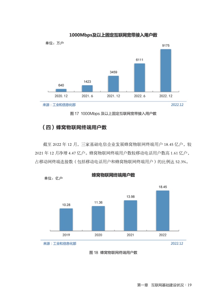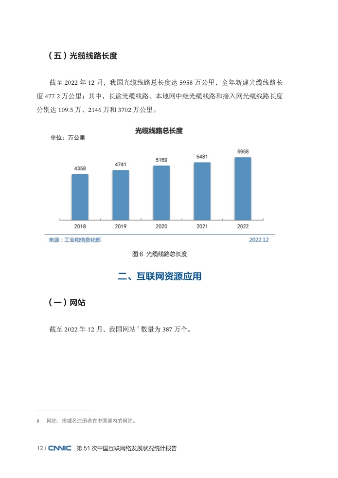 2022 年,我国互联网基础资源持续增长,IPv6 地址数量达 67369 块 / 32,同比增长 6.8%,有力支撑下一代互联网规模部署。我国光缆线路总长度达到 5958 万公里,比上年末净增 477 万公里,网络运力不断增强;我国千兆光网已经具备覆盖超过 5 亿户家庭的能力,5G 基站数量达 231 万个。千兆城市平均城市家庭千兆光纤网络覆盖率超过 100%,实现城市家庭千兆光网全覆盖。