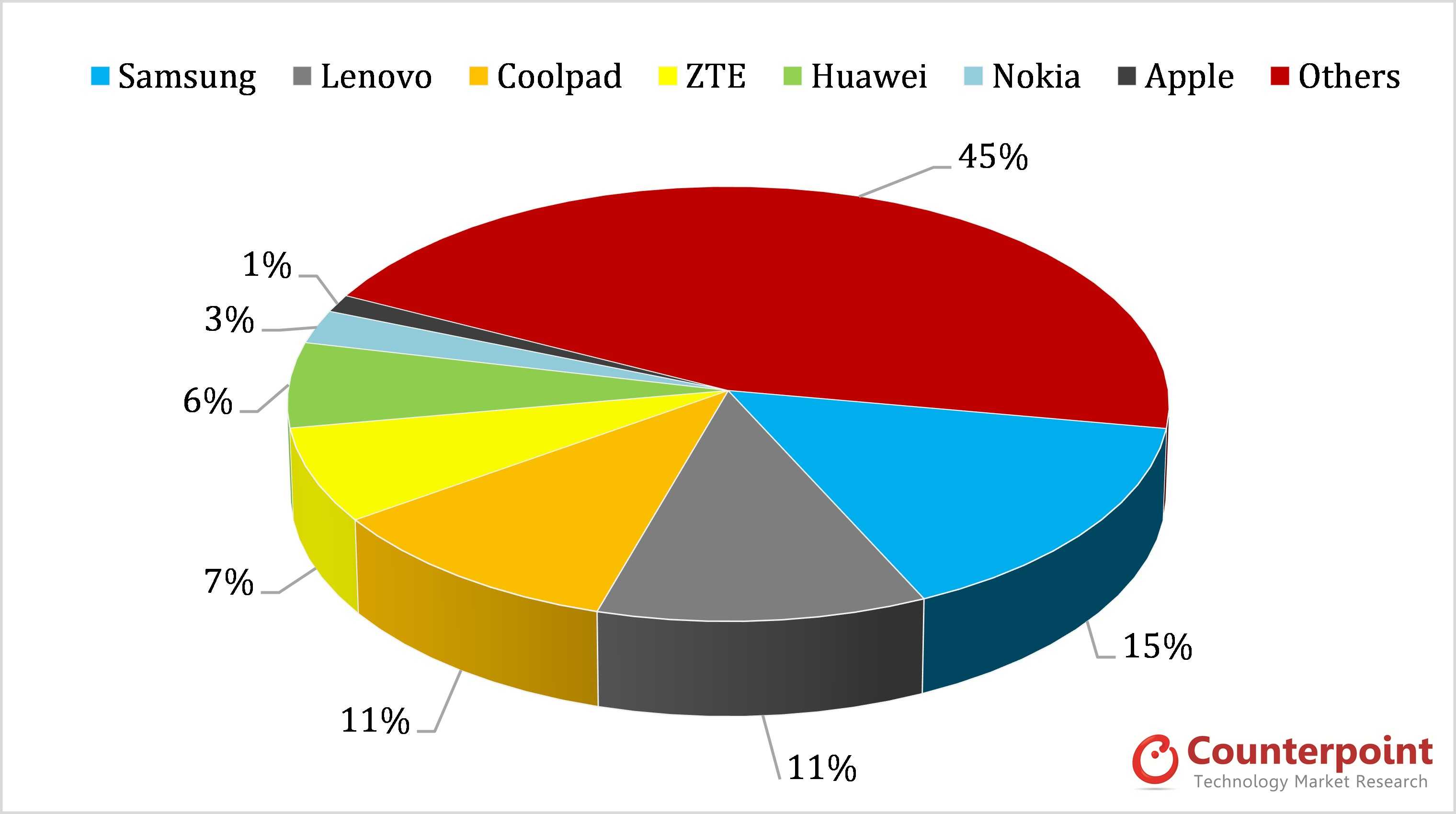 8月份各厂商的销量份额方面,三星电子虽然以15%的份额保住了首位宝座,但其份额有所下滑。接下来的排名是,联想和酷派均为11%,中兴7%,华为6%,诺基亚3%,苹果1%。