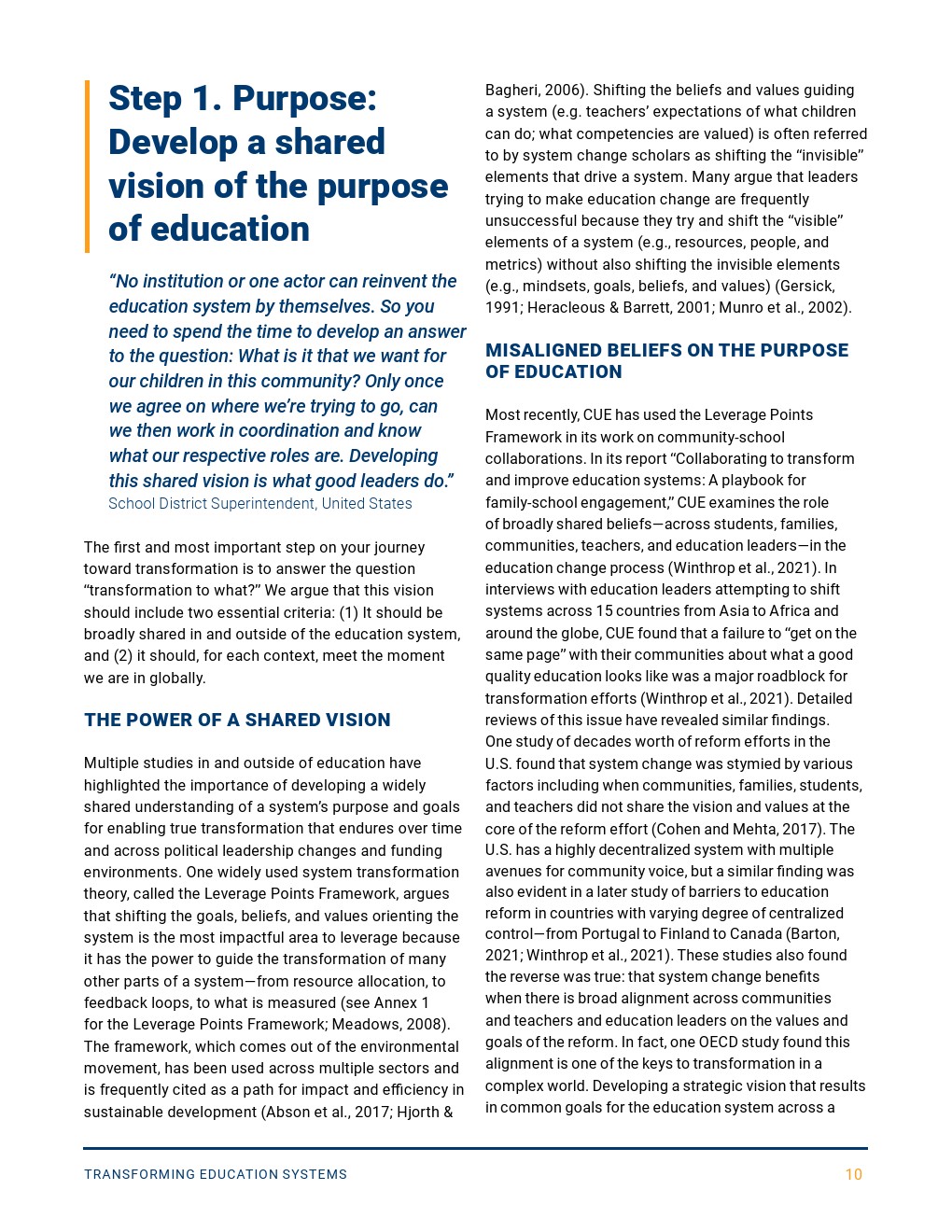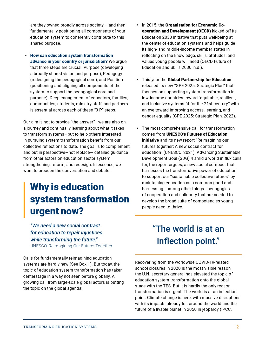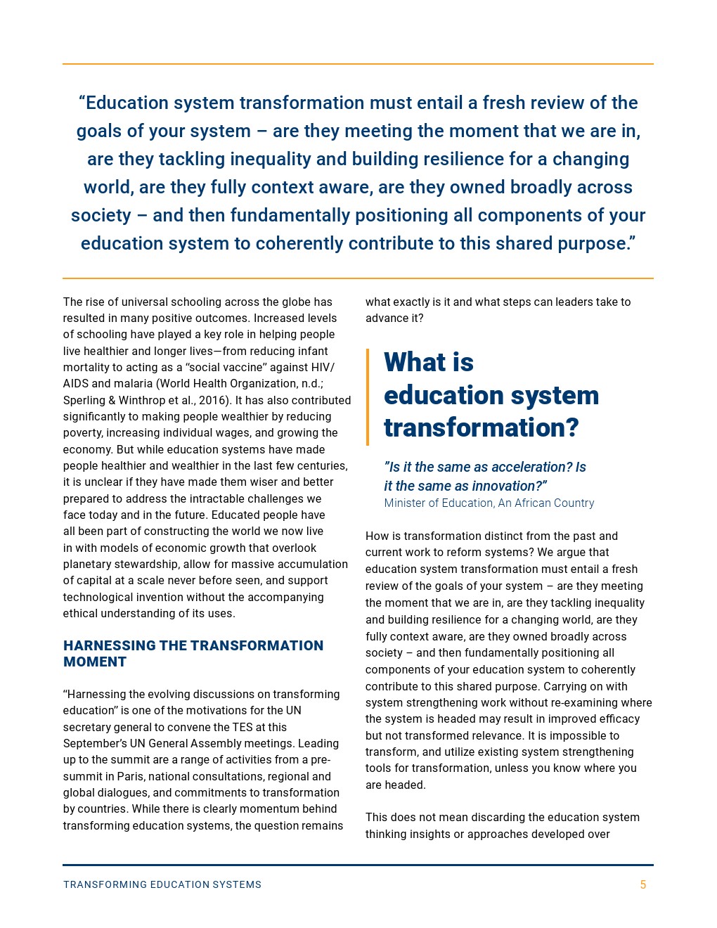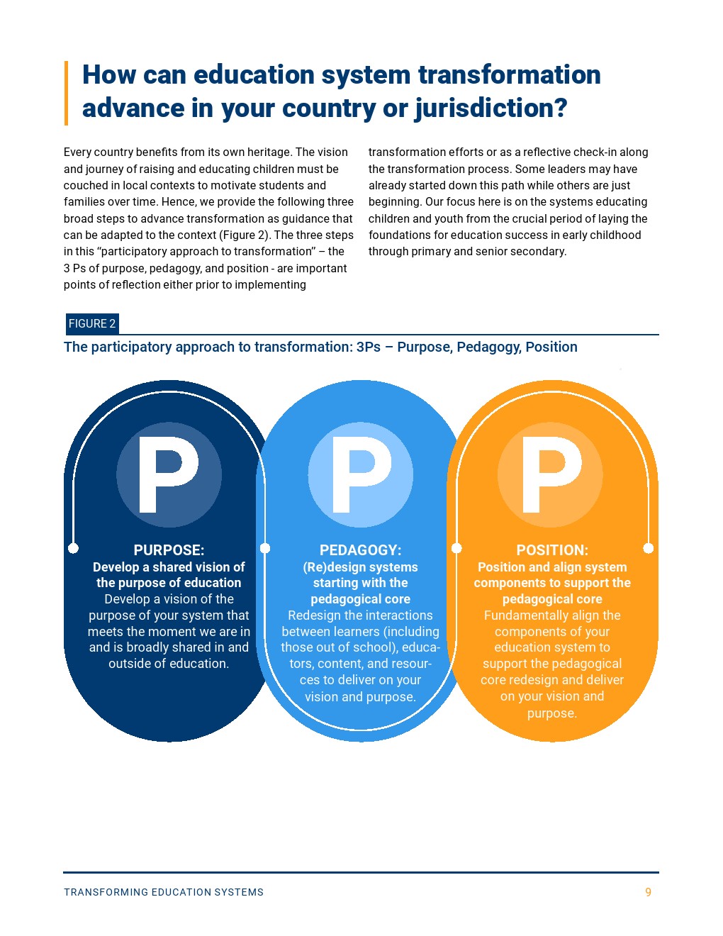 “利用不断发展的教育转型讨论”是联合国秘书长在9 月的联合国大会会议上召集 TES 的动机之一。 为峰会做准备的一系列活动包括巴黎峰会、全国磋商、区域和全球对话,以及各国对转型的承诺。虽然改革教育系统背后有明显的动力,但问题仍然是它究竟是什么以及领导者可以采取哪些步骤来推进它?