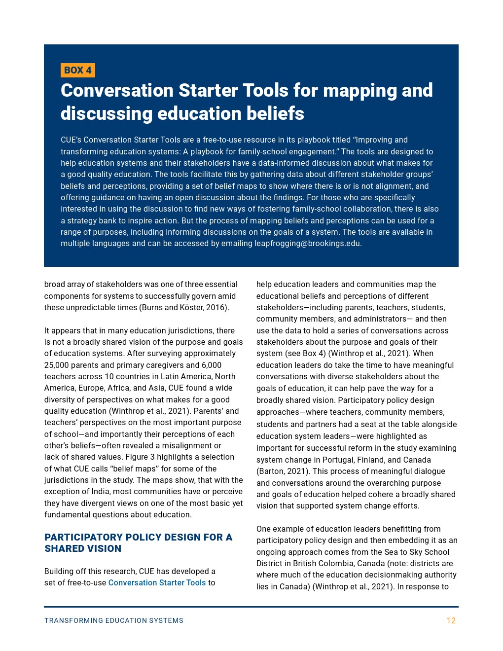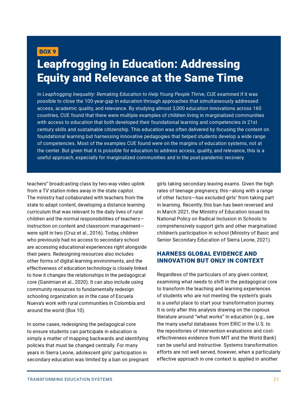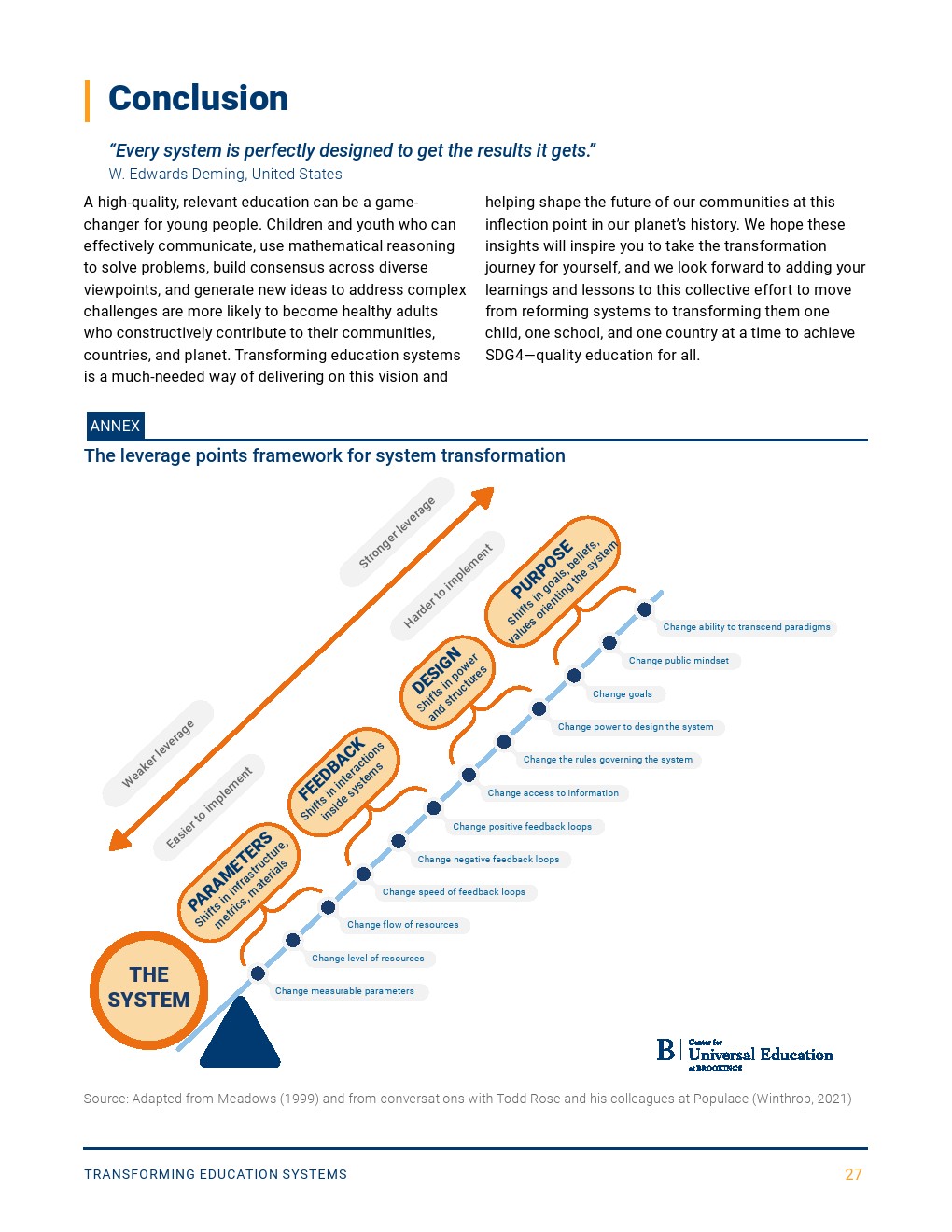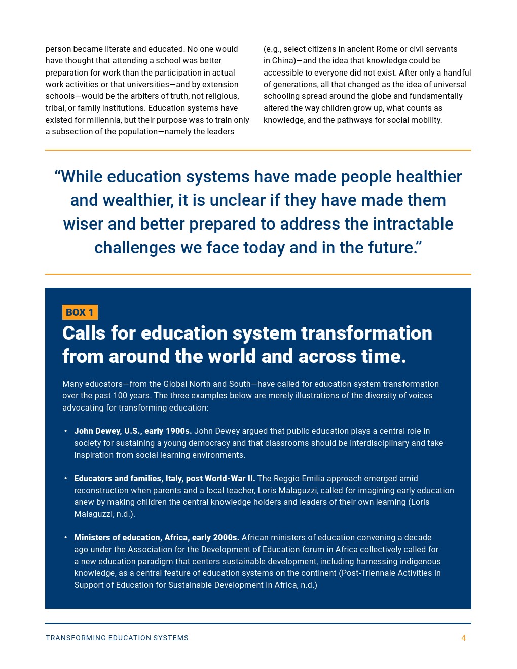 转型与过去和当前的体制改革工作有何不同? 我们认为,教育系统转型必须重新审视系统目标,它们是否满足我们所处的时刻,它们是否解决不平等问题并为不断变化的世界建立弹性,它们是否充分了解环境,它们是否广泛普及并从根本上定位教育系统的所有组成部分,以连贯一致地为这一共同目标做出贡献。 继续系统强化工作而不重新检查系统的发展方向可能会提高效率,但不会改变相关性。 除非你知道你要去哪里,否则无法改造,也无法利用现有的系统强化工具并进行改造。