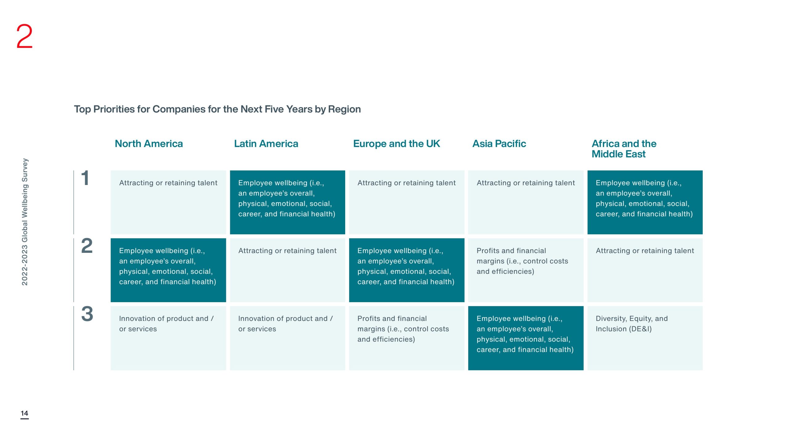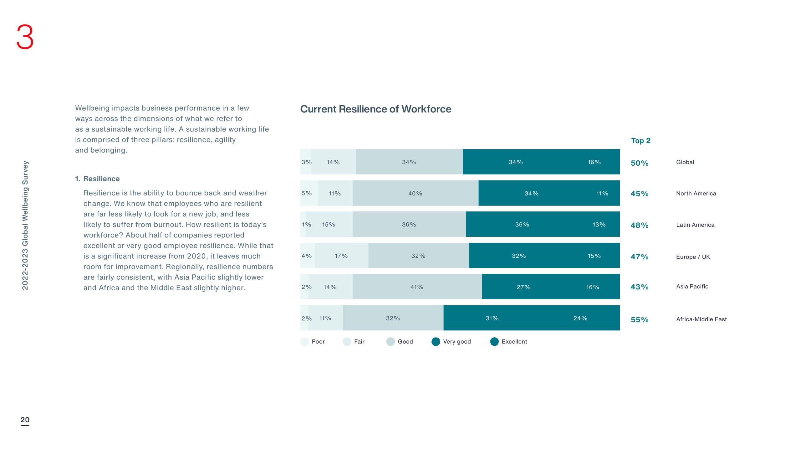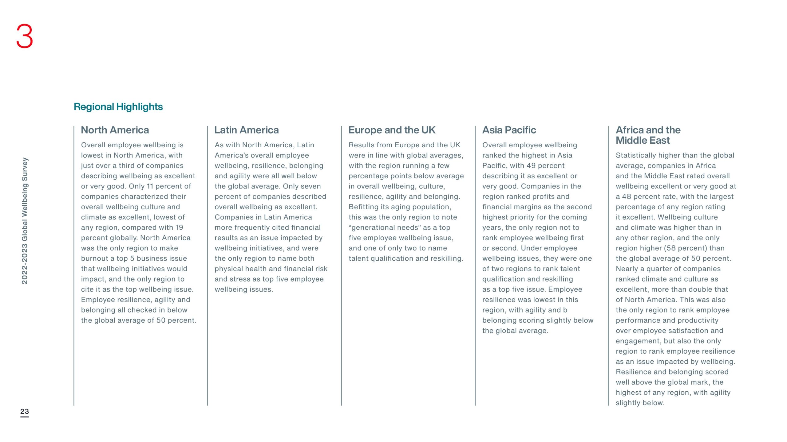 - 全球 75% 的受访者表示员工福祉对他们的公司很重要,非洲和中东(82%)、拉丁美洲(80%) 和欧洲(80%) 地区最有可能这样说。