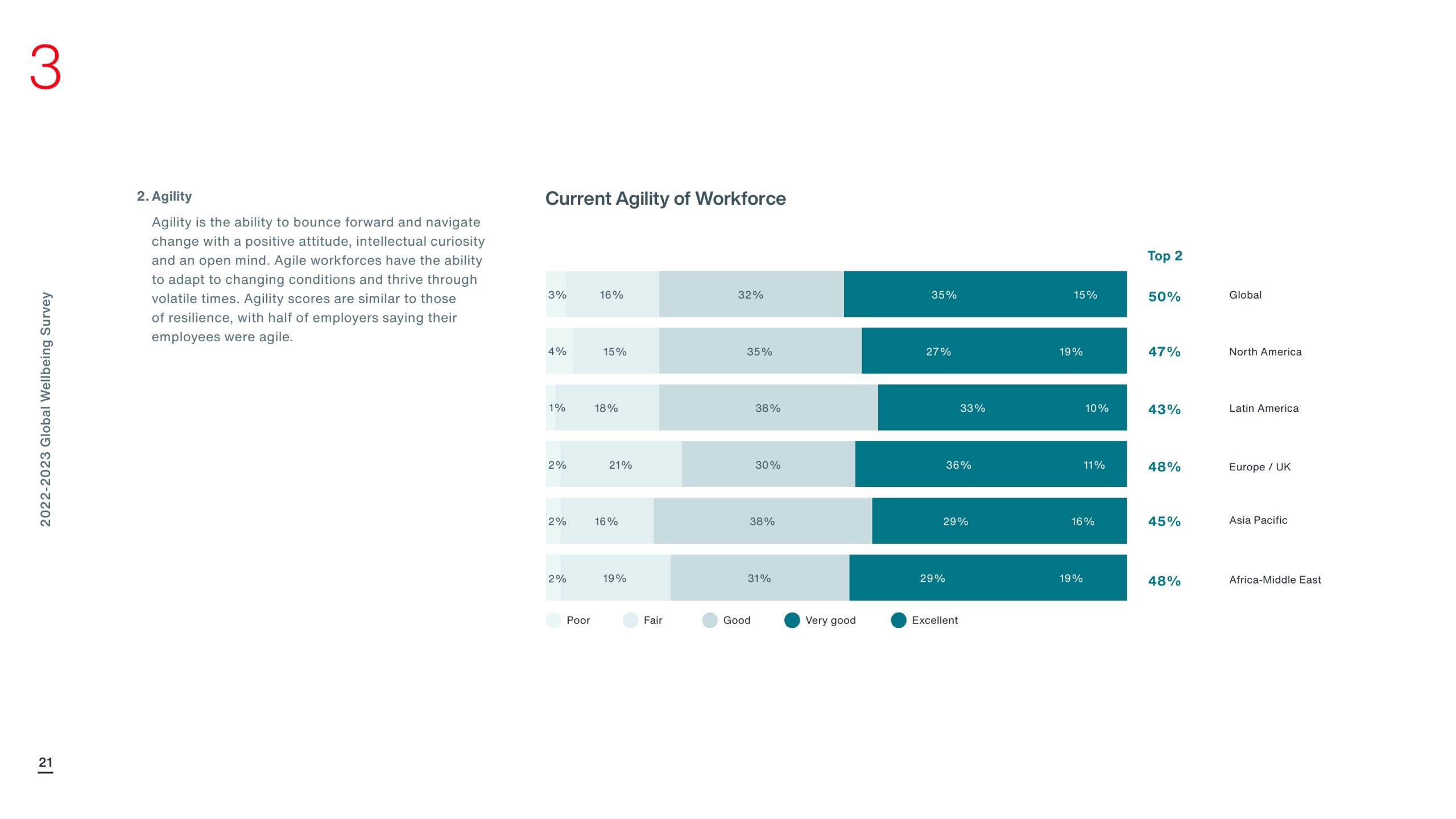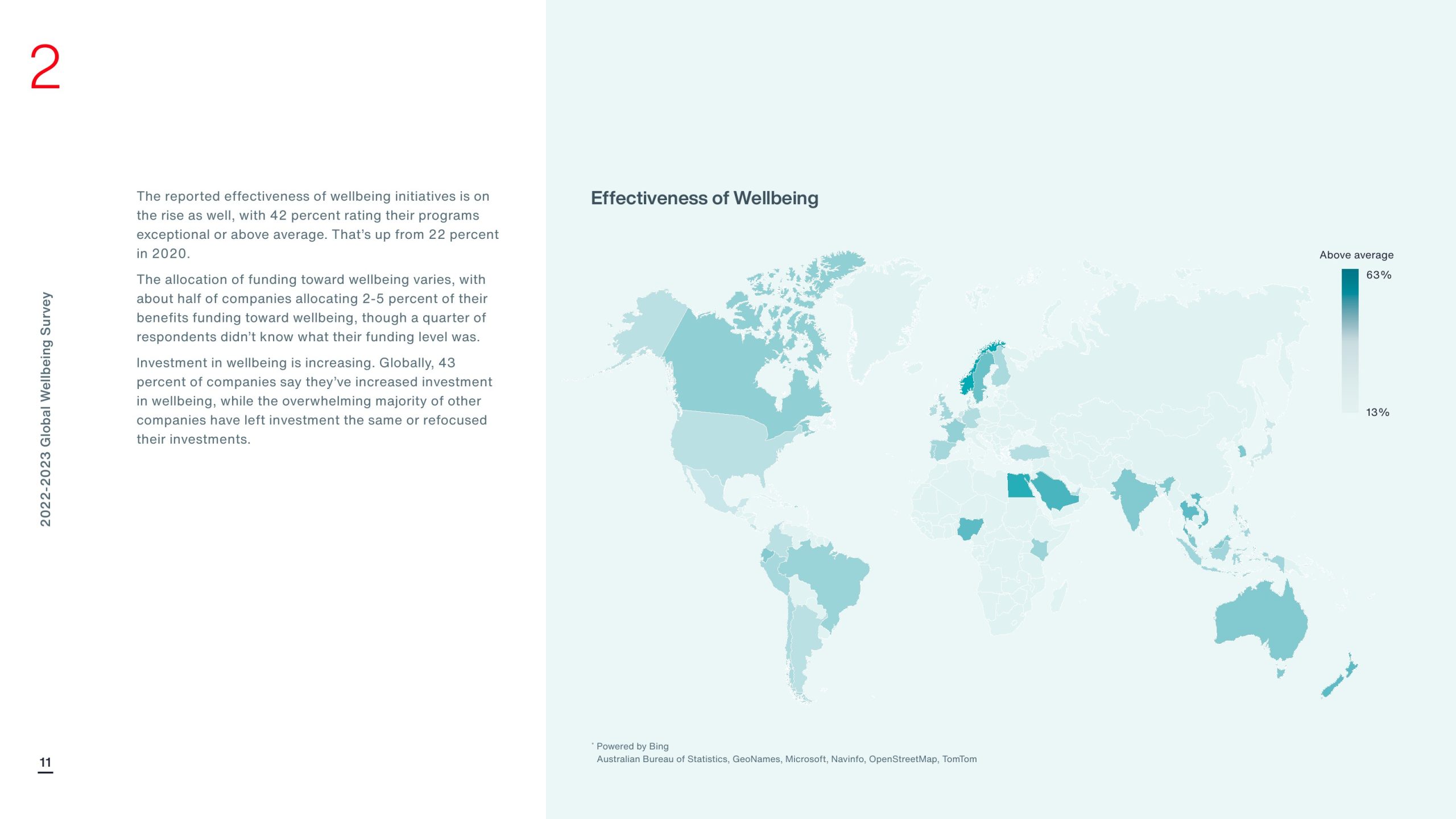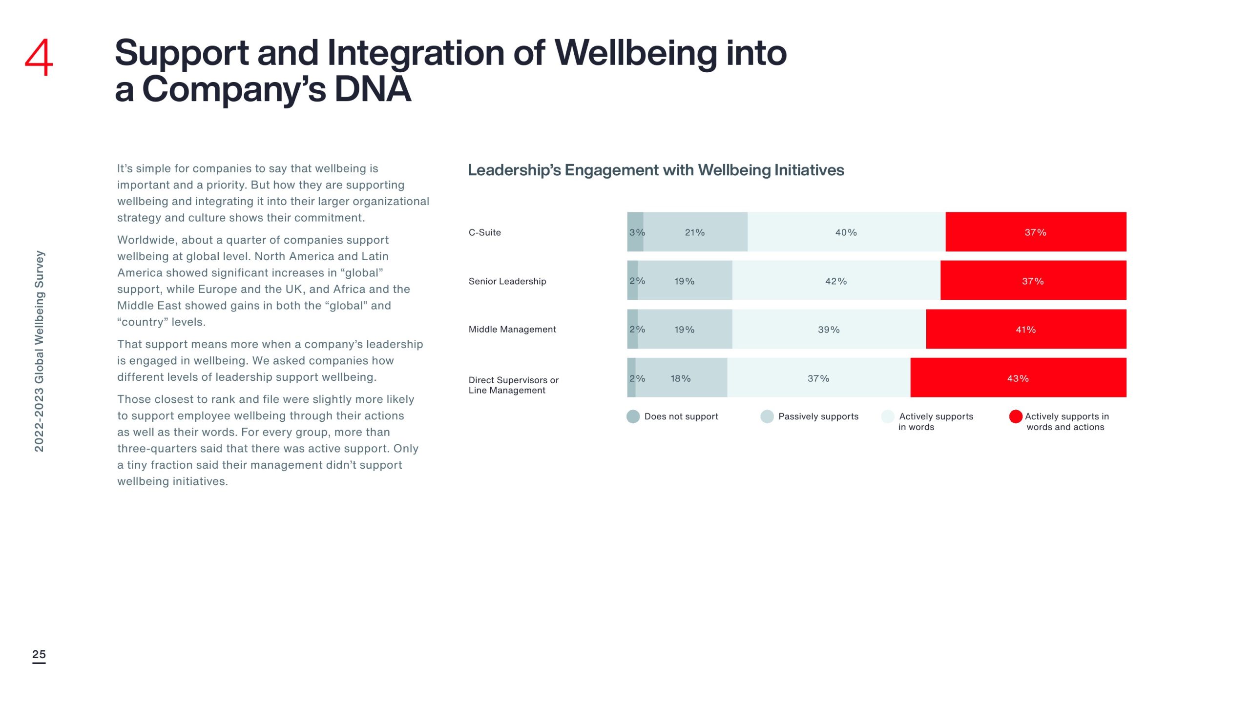- 全球 75% 的受访者表示员工福祉对他们的公司很重要,非洲和中东(82%)、拉丁美洲(80%) 和欧洲(80%) 地区最有可能这样说。