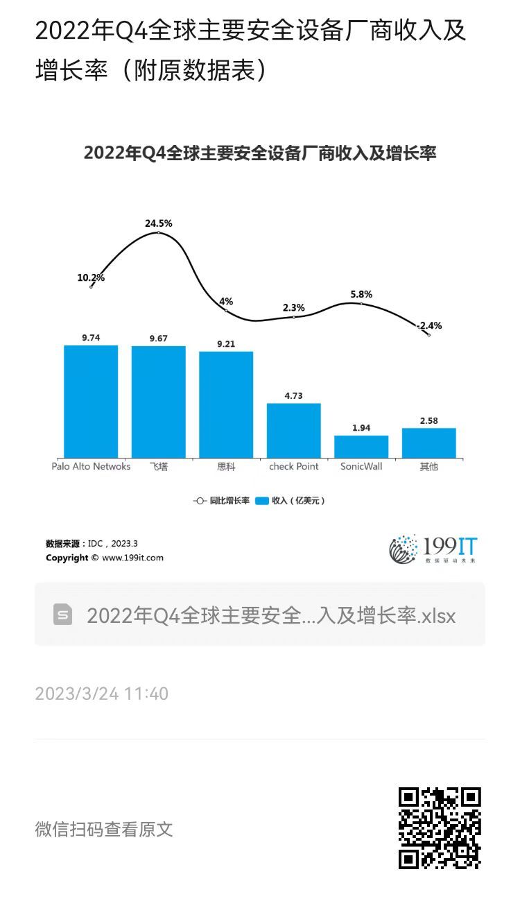 - 2023年Q4全球主要安全设备厂商收入市场份额(附原数据表)