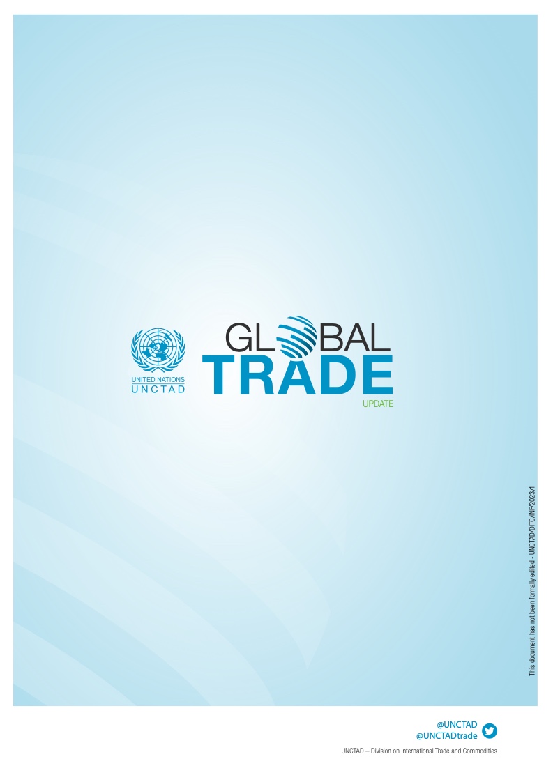 联合国贸发会议对 2023 年第一季度的预测显示,全球商品贸易总额将增长约 1%。与此同时,由于对信息和通信技术服务的需求继续增长,旅行和旅游部门进一步复苏,服务贸易总额将增长约 3%。