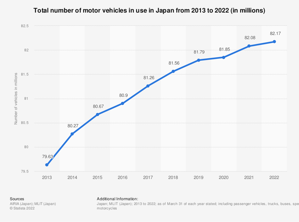 2013-2022年日本汽车使用总数(百万) 数据来源:Statista.com