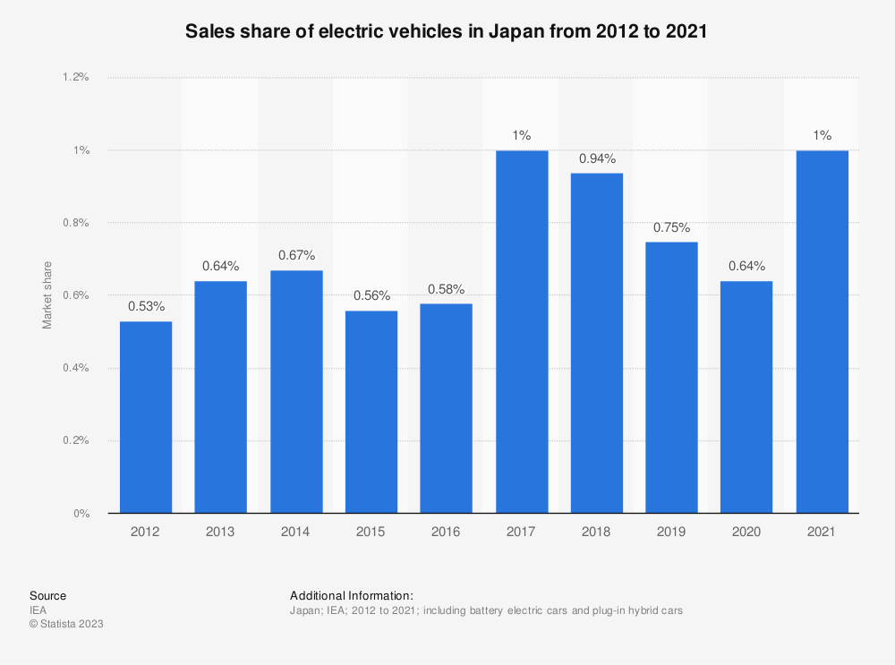 2012年至2021年日本电动汽车的销售份额 数据来源:Statista.com