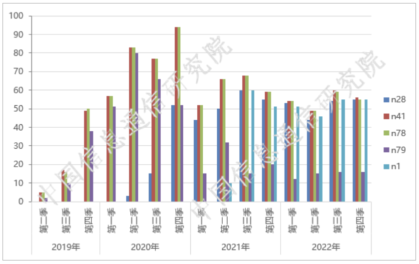 根据中国信息通信研究院统计分析,2022年第四季度申请进网检测的56款5G手机中,支持n41的占比100%,支持n78的占比98.2%,支持n79的占比28.6%,支持n28的占比为98.2%,支持n1的占比为98.2%。