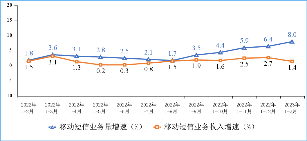 移动电话通话量低速增长,移动短信业务量增速持续回升。1—2月份,移动电话去话通话时长完成3583亿分钟,同比增长3.1%;固定电话主叫通话时长完成114.4亿分钟,同比下降5.2%。1—2月份,全国移动短信业务量同比增长8%;移动短信业务收入同比增长1.4%,增速较上年末分别提升1.6个和回落1.3个百分点。