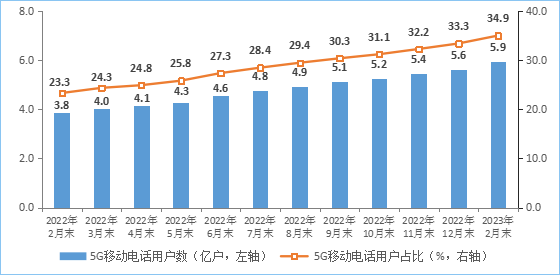 移动电话用户数稳中有增,5G用户占比不断提升。截至2月末,三家基础电信企业的移动电话用户总数达16.95亿户,比上年末净增1188万户。其中,5G移动电话用户达5.92亿户,比上年末净增3129万户,占移动电话用户的34.9%,占比较上年末提升1.6个百分点。