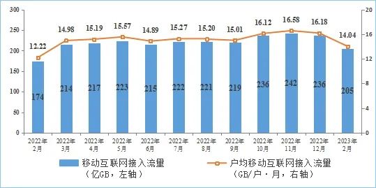 移动互联网流量增速有所回落。1—2月份,移动互联网累计流量达417.9亿GB,同比增长12%,增速同比回落8.7个百分点。截至2月末,移动互联网用户数达14.68亿户,比上年末净增1422万户。2月当月户均移动互联网接入流量(DOU)为14.04GB/户·月,同比增长14.8%,但较上年12月份低2.14GB/户·月。