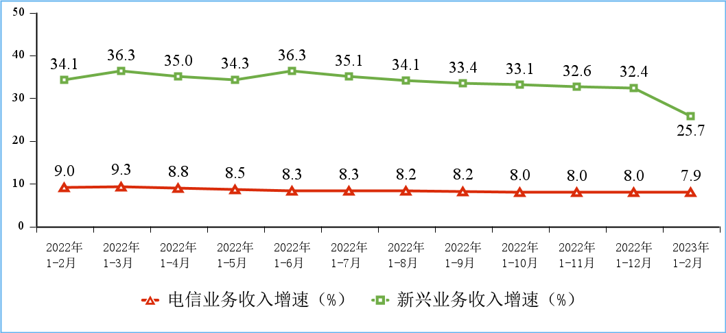 移动数据流量业务收入低速增长。1—2月份,三家基础电信企业完成移动数据流量业务收入1079亿元,同比增长0.1%,在电信业务收入中占比为38.5%,拉动电信业务收入增长0.1个百分点。