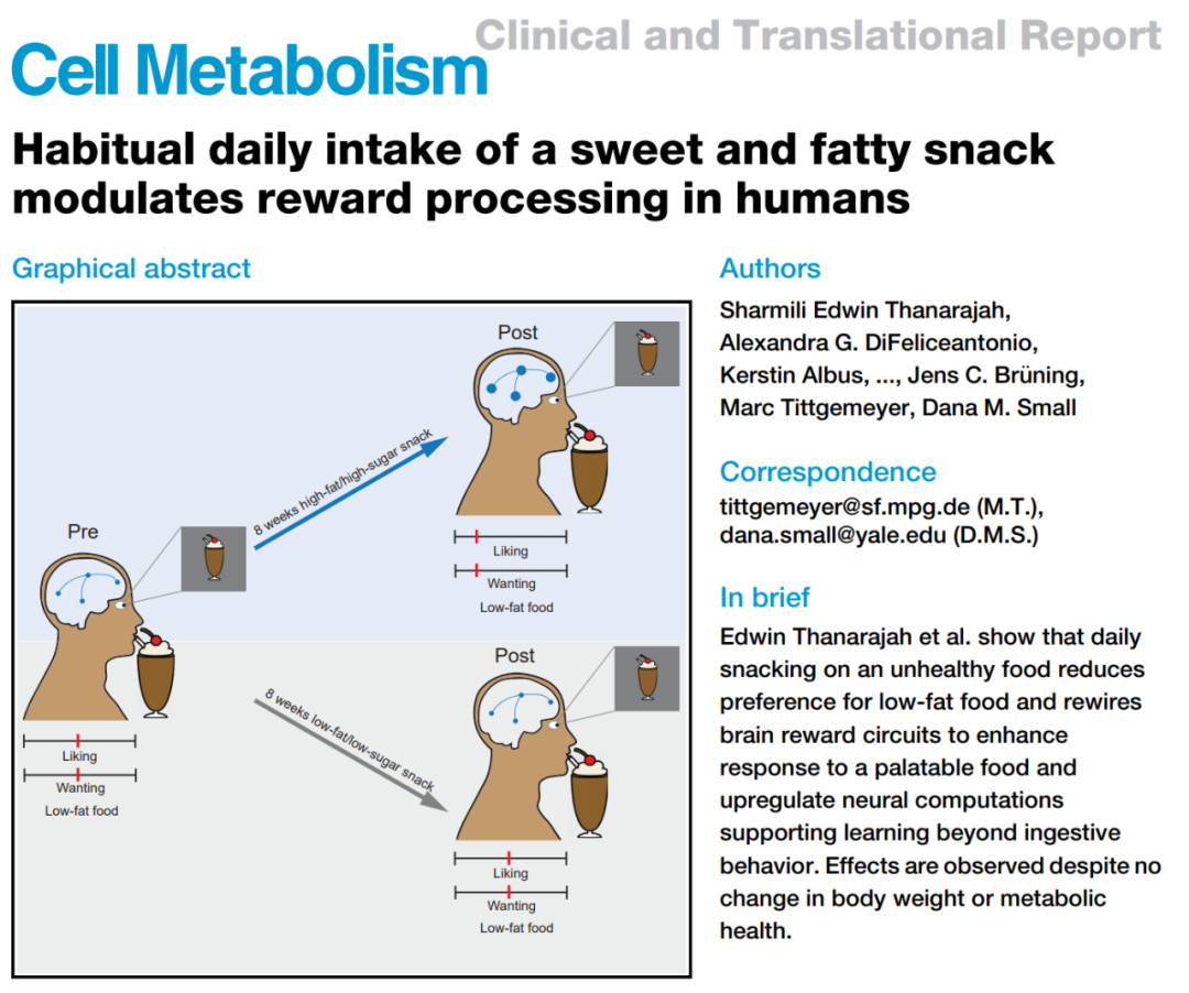 [1]Edwin Thanarajah S, Difeliceantonio A G, Albus K, et al. Habitual daily intake of a sweet and fatty snack modulates reward processing in humans[J]. Cell Metabolism, 2023.