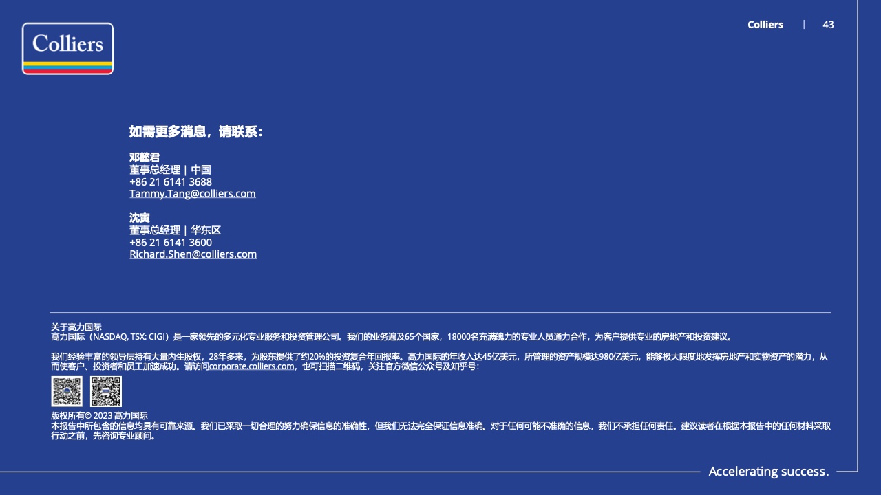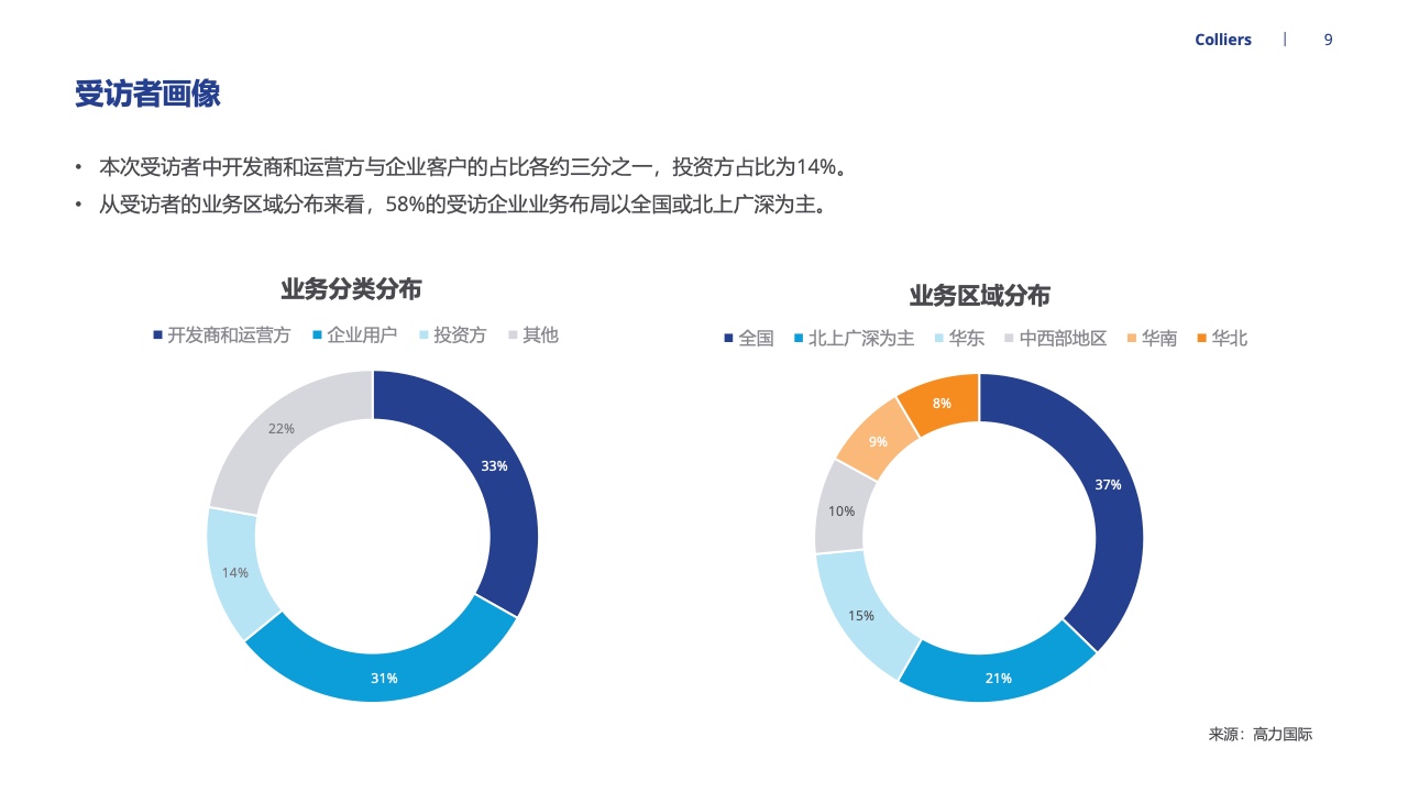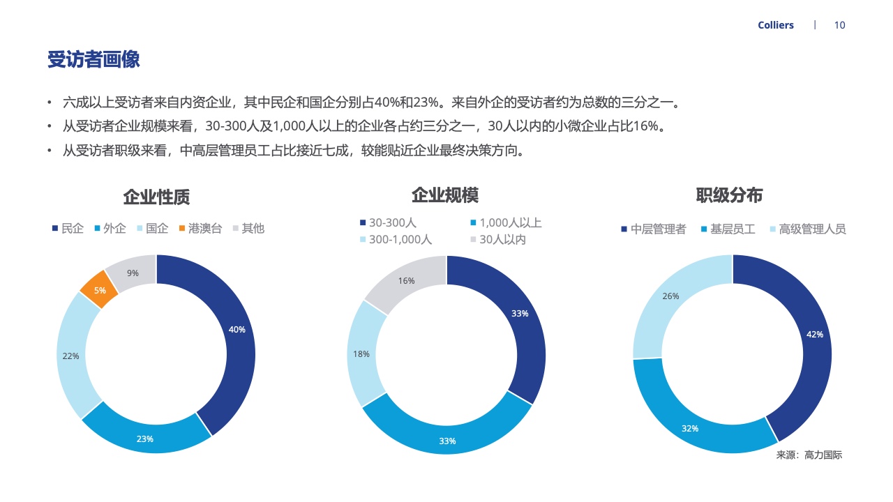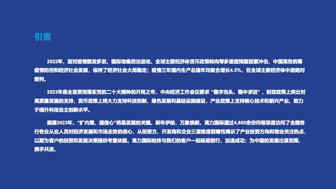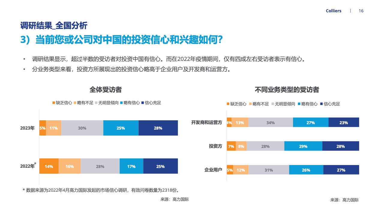 总体来看,50%的受访者预测其公司将加大在中国的投资,其中近30%的受访者表示将大幅增加对华投资。值得注意的是,在2022年高力国际市场信心调研中,仅16%的受访者认为当年可能会有扩张计划,约六成的受访者表示投资规模不会变化。对比可见投资中国的热情已大幅提升。